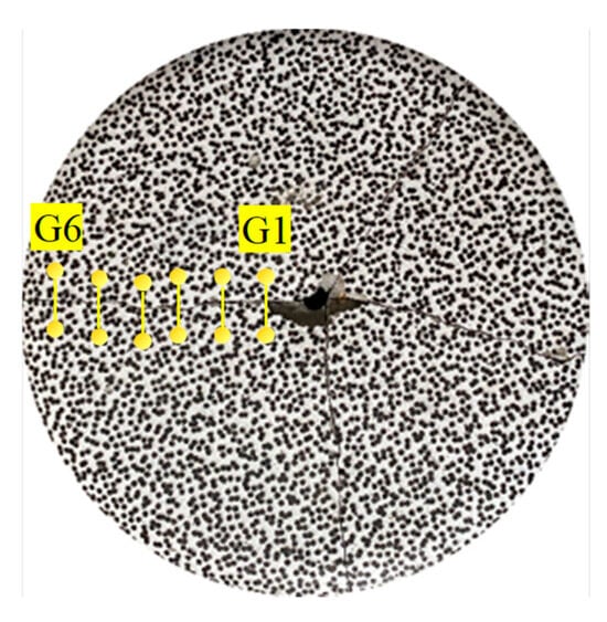 The fundamental cause of crack initiation in brittle materials lies in the emergence of strain inconsistencies within the continuous medium. When the tensile strain of the material exceeds its ultimate strain limit, cracking occurs. Consequently, crack propagation can be assessed by determining whether the material has reached its fracture strain. Six paired monitoring points (Figure 12), designated G1–G6, were positioned along the crack propagation path at 1 cm intervals, with monitoring point G1 located 2 cm from the blast hole.