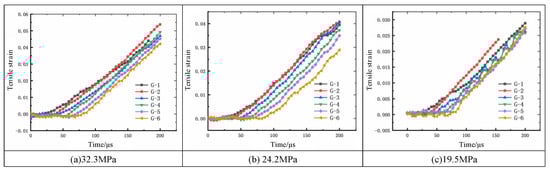 Using the methodology described in the preceding section, the propagation velocity of directional cracks was calculated for three rock masses of differing strengths. The corresponding tensile strain time history curves are presented in Figure 14. It can be observed that the tensile strain at different measurement points evolves sequentially, and the tensile strain curves for rock masses of varying strengths exhibit similarities.