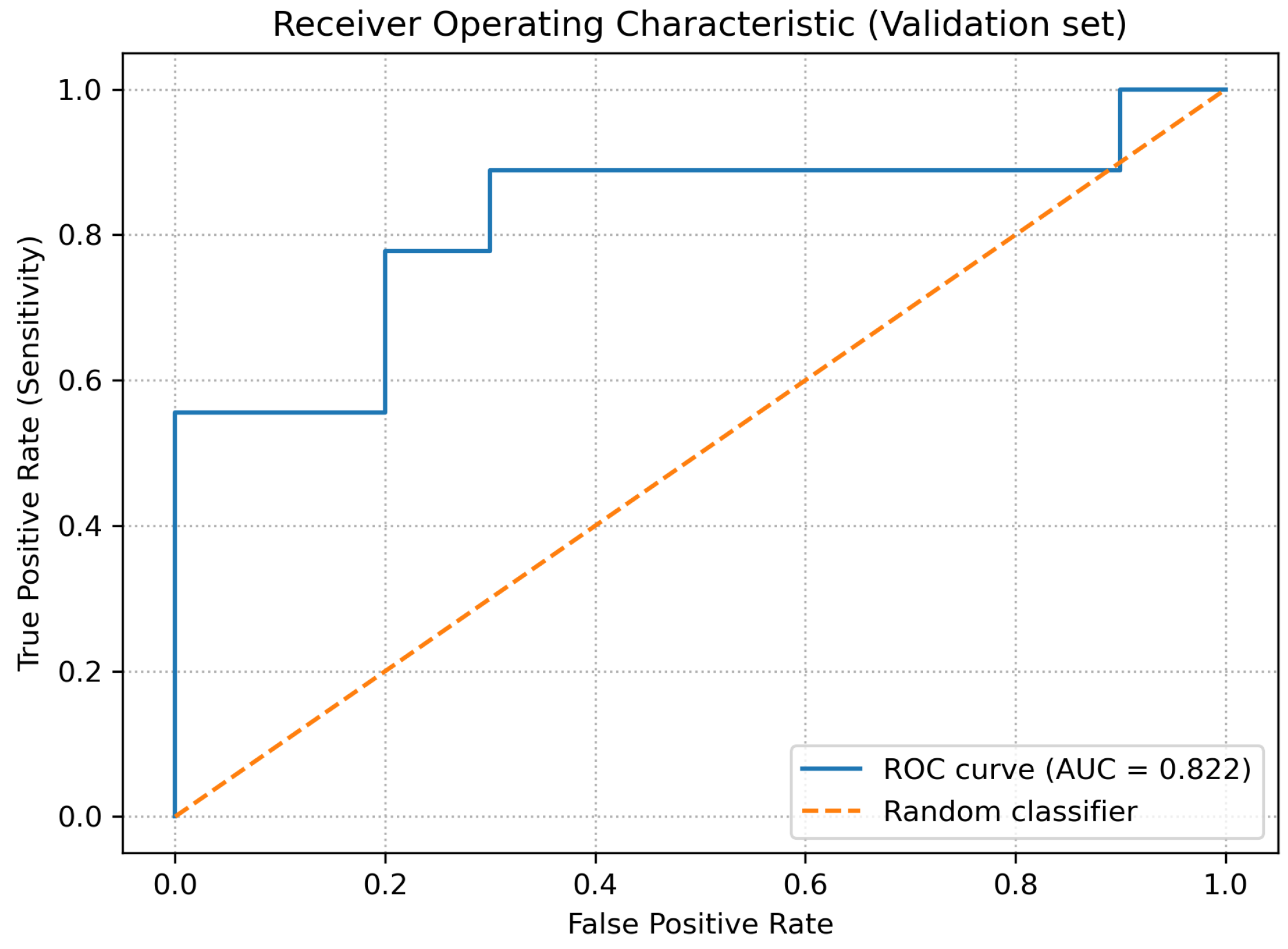 Figure 3, the ROC curve demonstrates consistent discrimination between fracture and non-fracture cases across decision thresholds, with an AUCROC of 0.822. Complementarily,