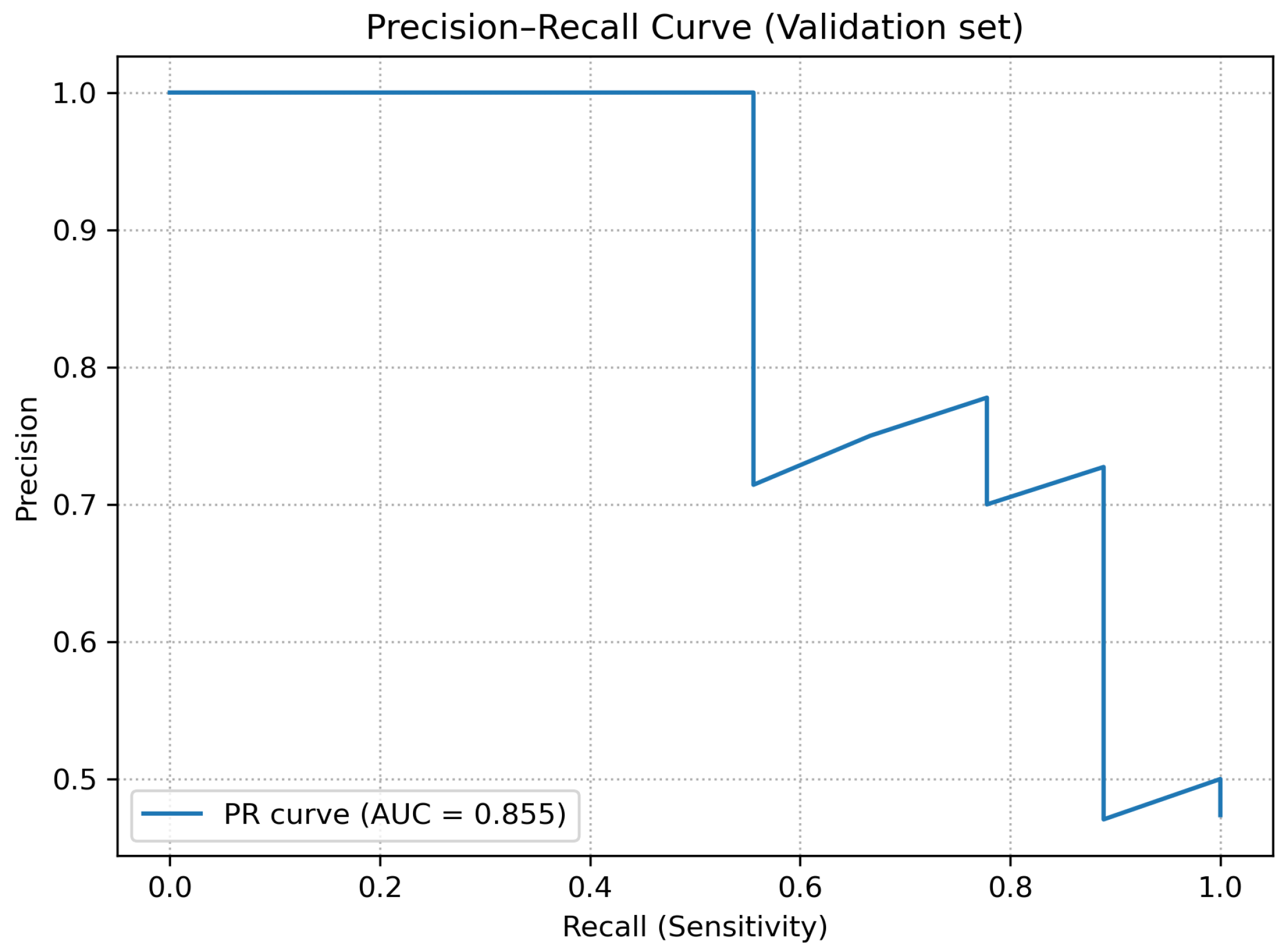 Figure 4 presents the precision–recall curve, highlighting stable precision levels over a wide range of recall values, which is particularly relevant given the moderate class imbalance in the validation dataset.