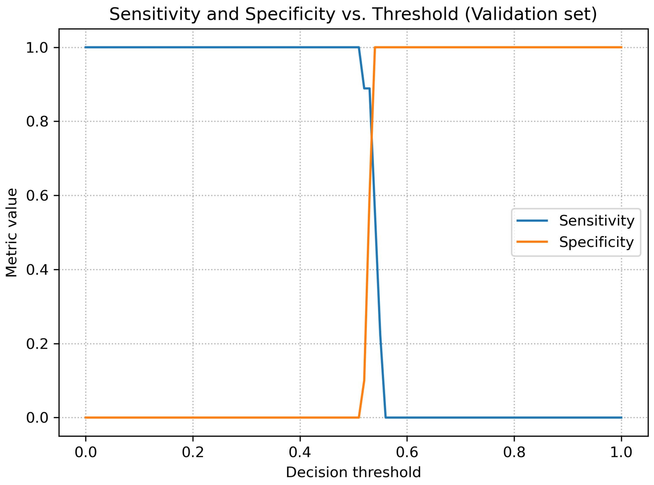Figure 5 shows the relationship between sensitivity and specificity as a function of the threshold. For low threshold values, the model achieved very high sensitivity at the cost of low specificity, whereas for higher thresholds the opposite trend was observed.
