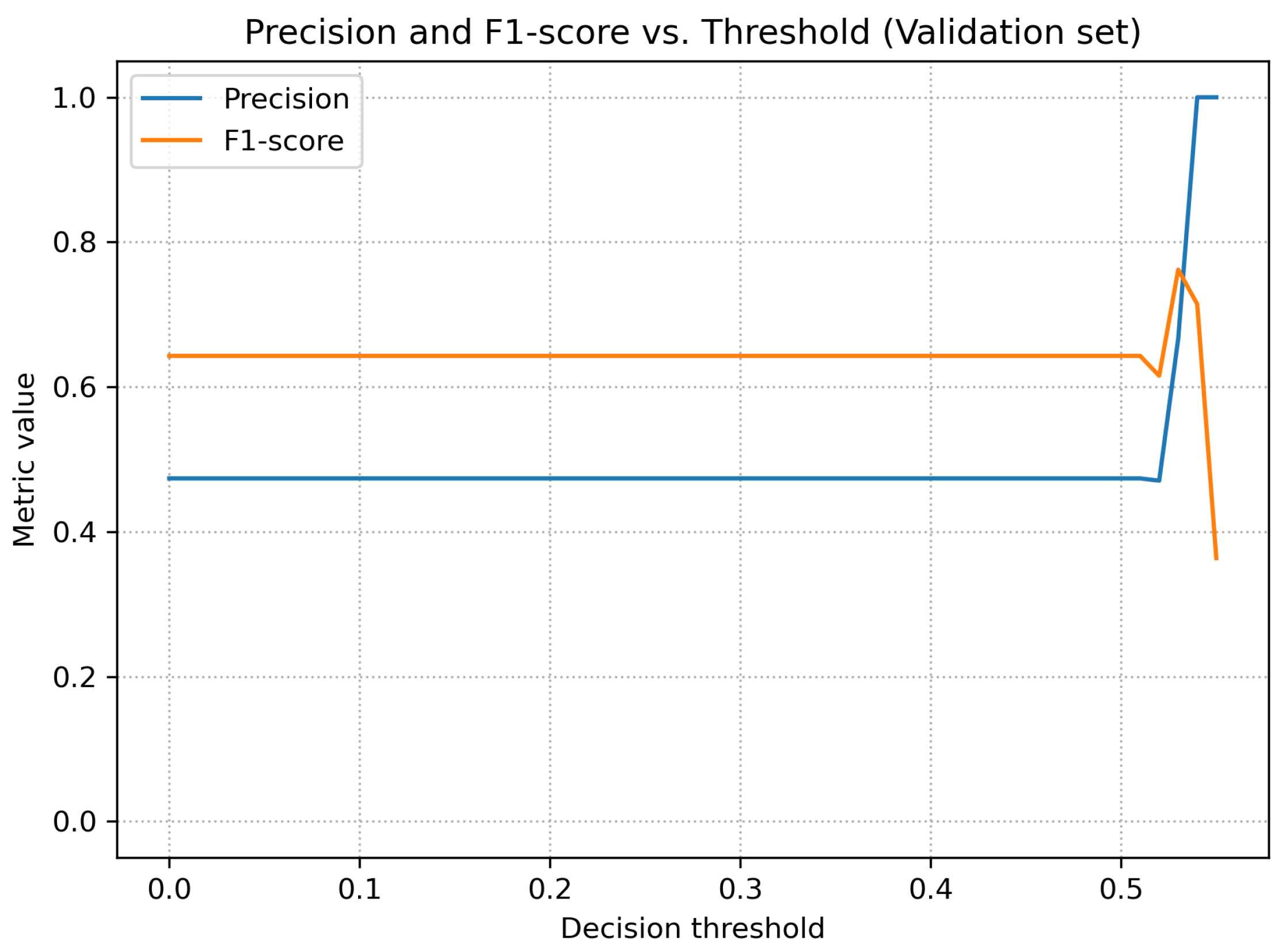 Figure 6 presents the behavior of precision and F1-score as functions of the threshold.