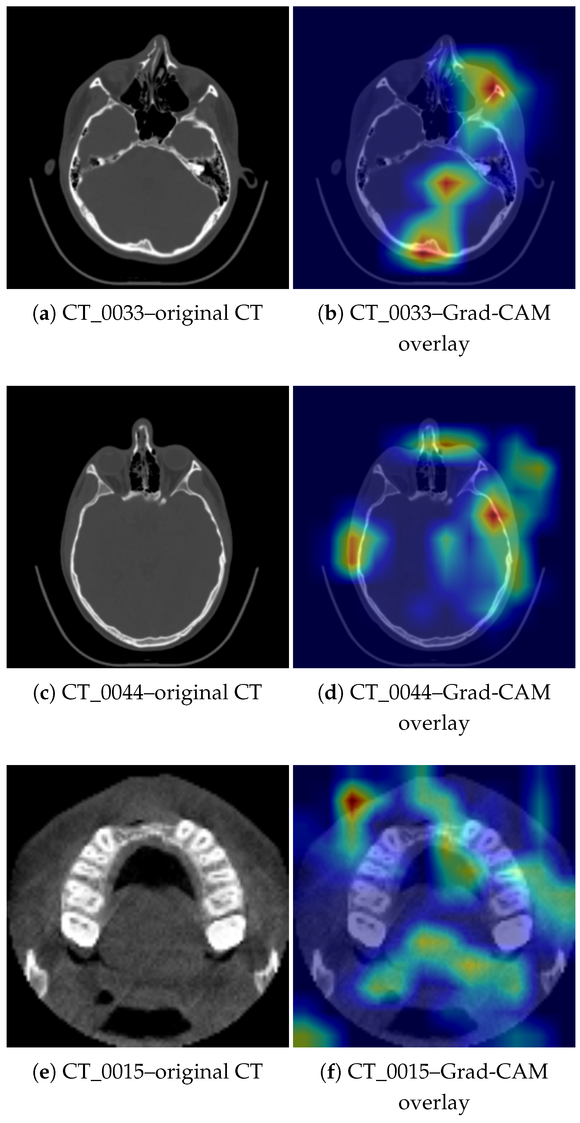 Figure 7 presents original CT slices alongside their corresponding Grad-CAM overlays. For CT_0033 (right-sided orbital–nasal fracture), the highlighted regions accurately follow the inferior orbital rim and the anterior wall of the maxillary sinus. For CT_0044 (left superior orbital rim fracture), Grad-CAM focuses on the fronto-zygomatic region, consistent with the documented injury. In CT_0015 (alveolar process fracture), the activation includes the anterior maxillary ridge but also extends toward unrelated soft-tissue structures, demonstrating known limitations of Grad-CAM saliency precision.