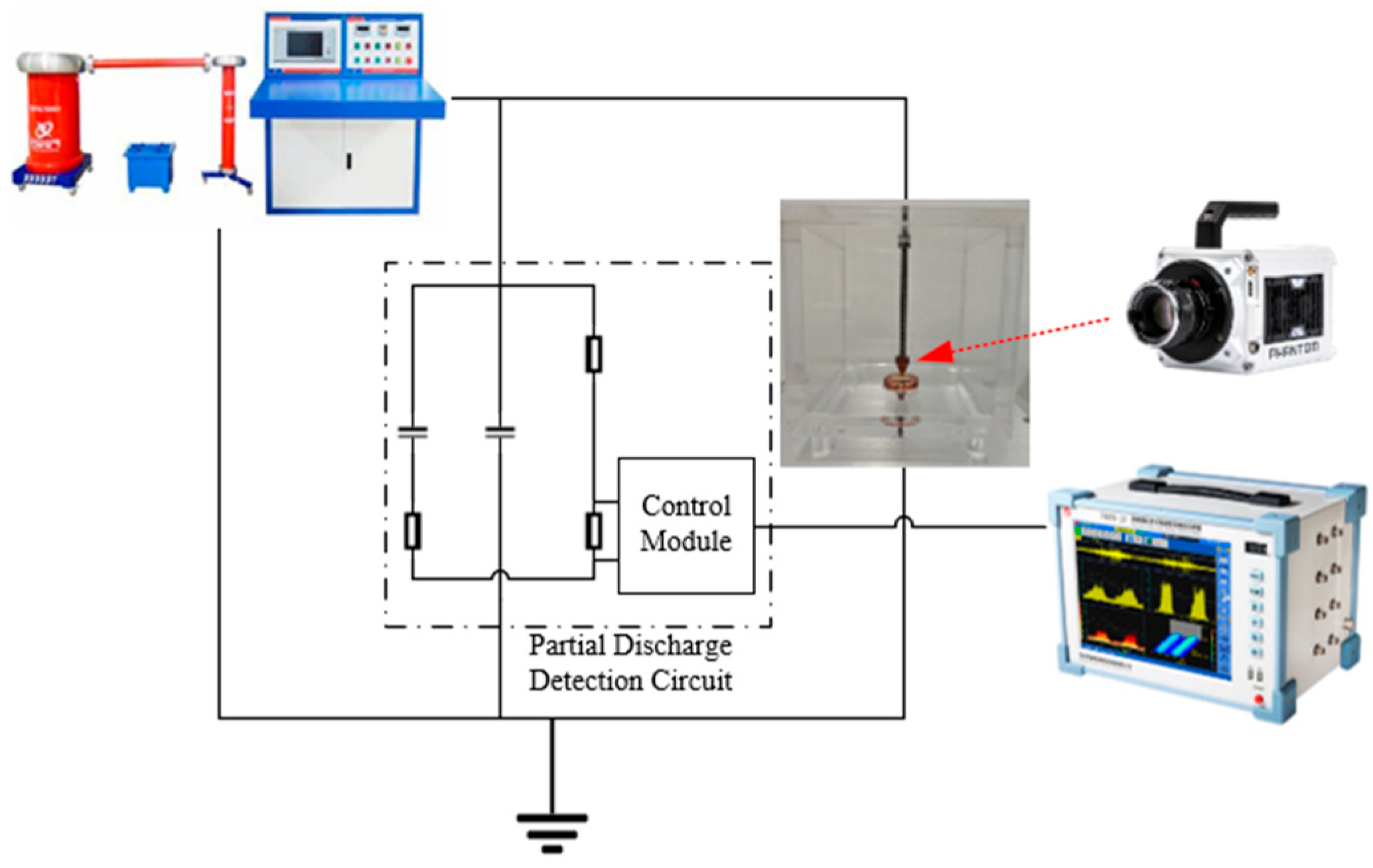 In addition, an experimental simulation platform for partial discharge studies was established using the laboratory’s existing AC high-voltage source, high-speed imaging system, and partial discharge detector, as shown in