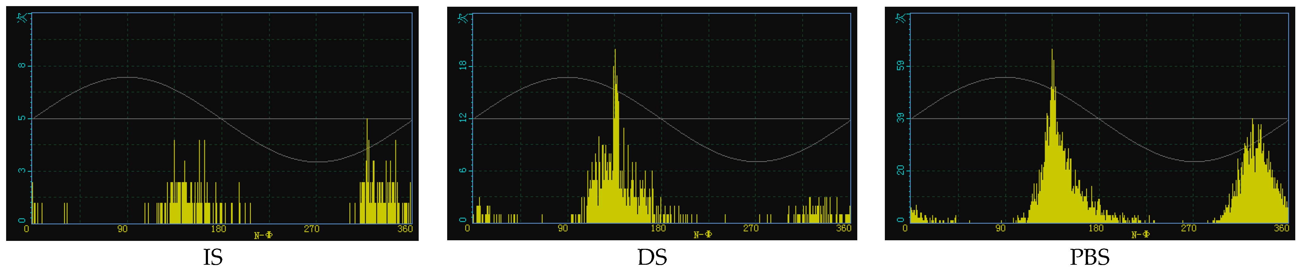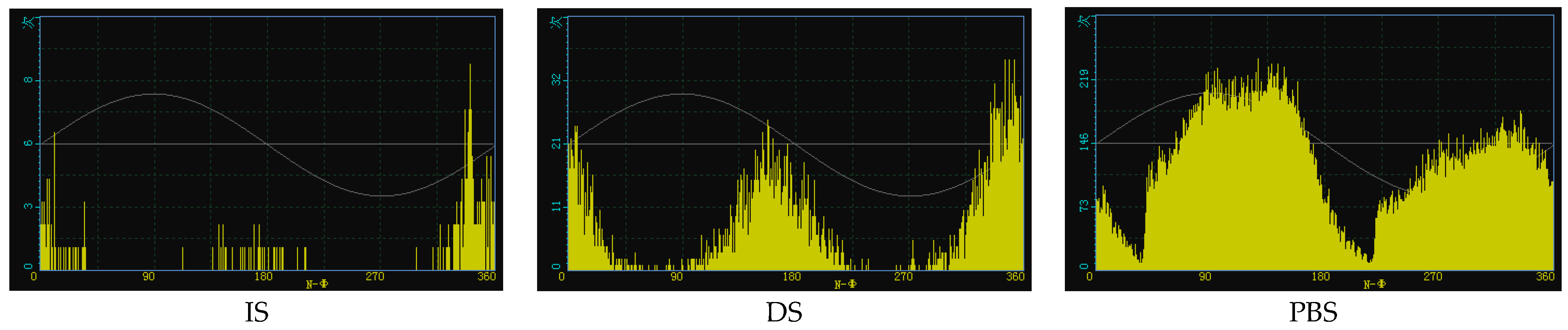 Based on the pulse-resolved partial discharge (PRPD) data, discharge amplitude maps and discharge frequency maps were constructed to reveal the phase-resolved distribution characteristics and energy concentration of the discharges over the entire cycle. Furthermore, the evolution of partial discharge activity was analyzed by dividing the discharge process into the Initiation Stage (IS), Development Stage (DS), and Pre-breakdown Stage (PBS).