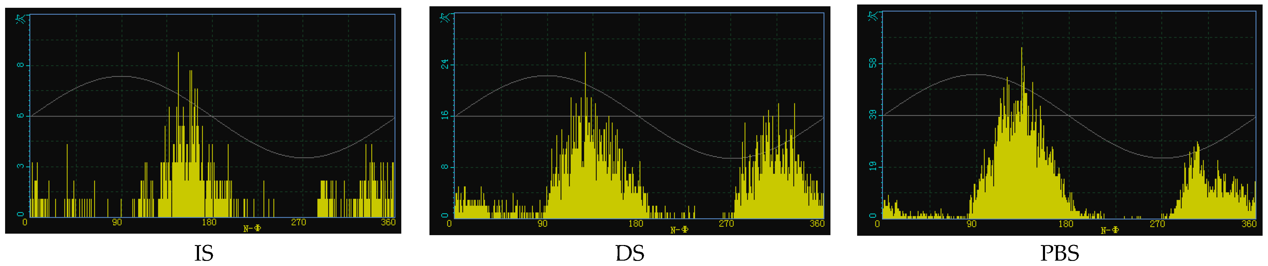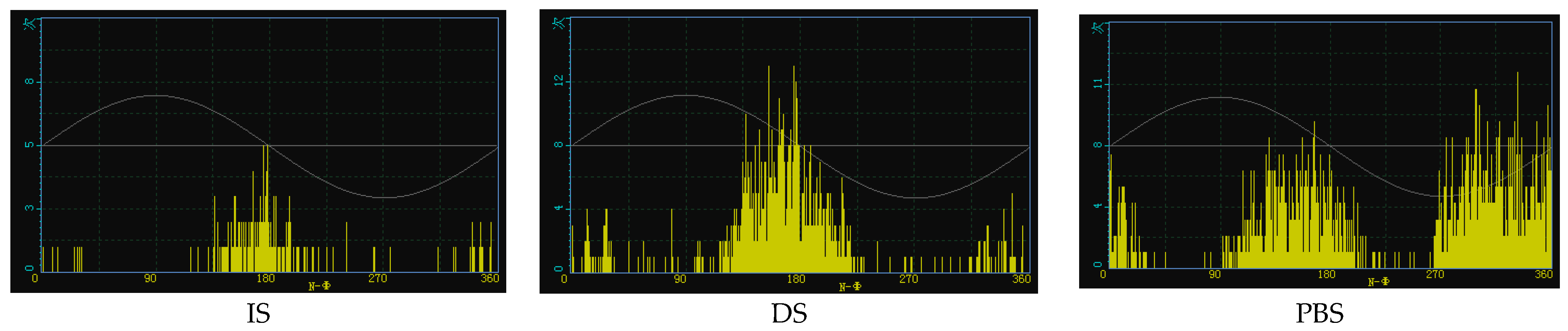 3.1. Partial Discharge Patterns of Oil–Paper Insulation