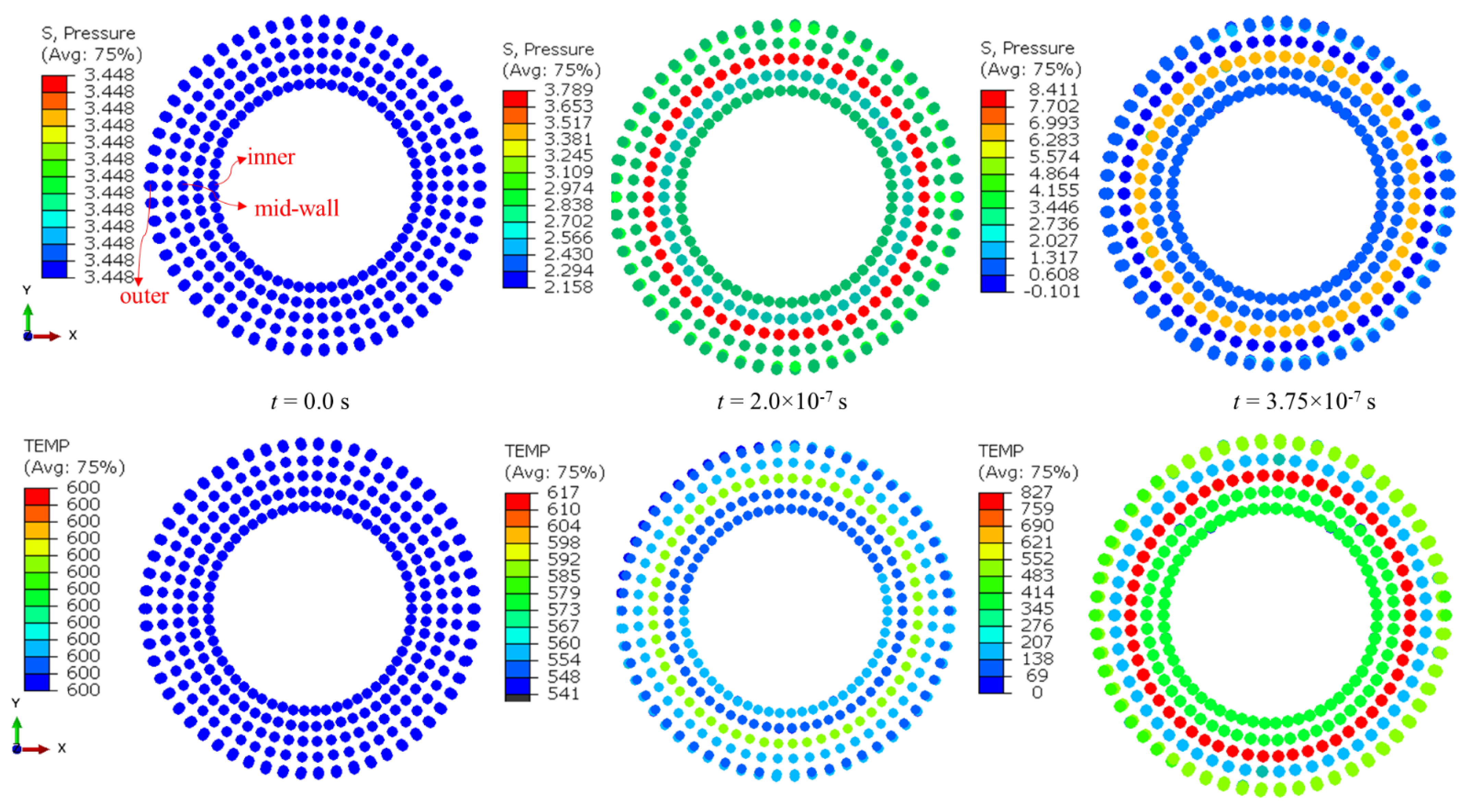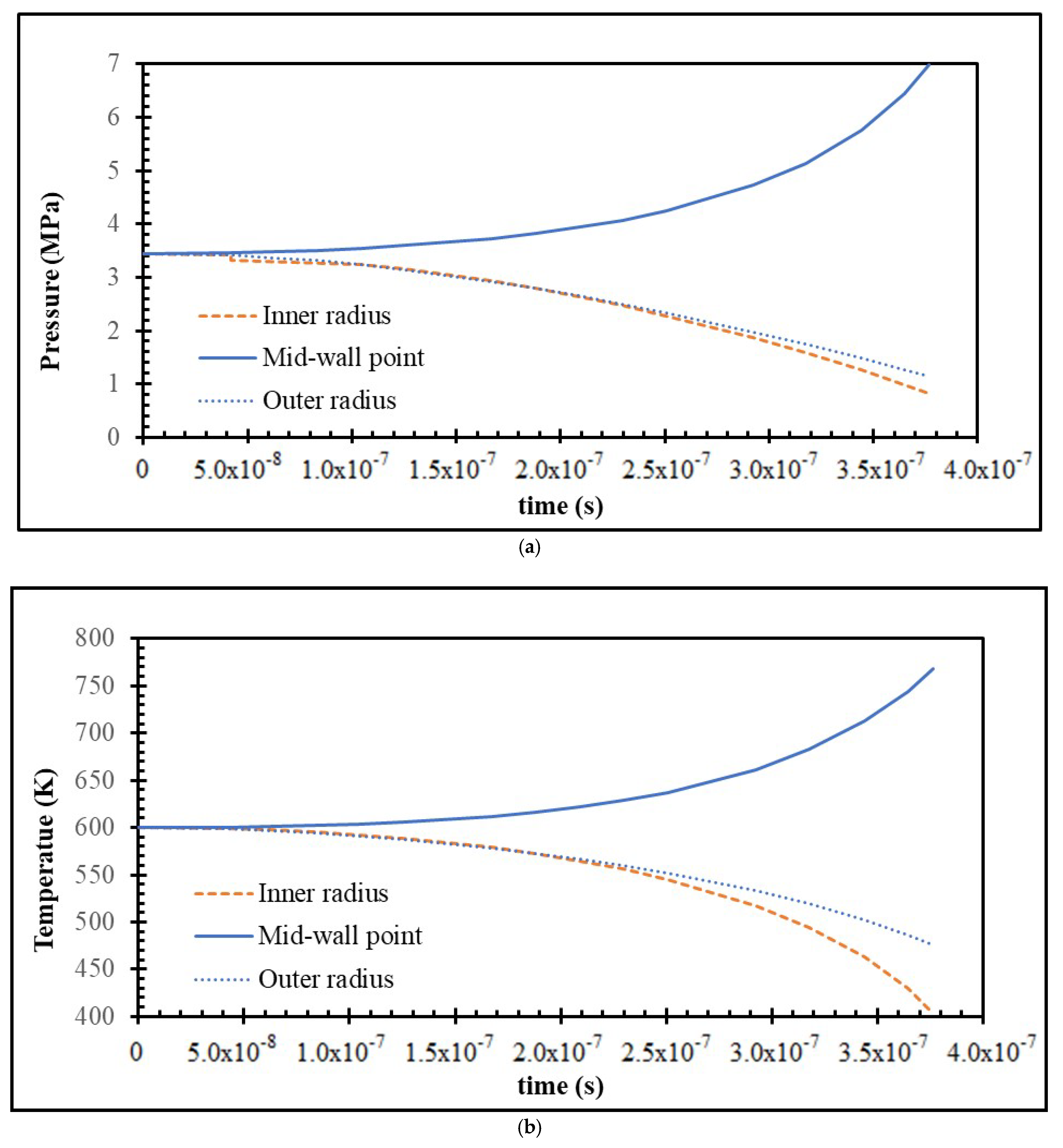 Figure 4 provides further insight into the temporal evolution of pressure and temperature at three characteristic radial positions—inner radius, mid-wall point, and outer radius. The pressure–time history shows an initially uniform distribution that diverges as the burst progresses. The mid-wall point exhibits a steadily increasing pressure, confirming that inertial effects and wave reflections sustain a localized buildup. Conversely, both the inner and outer radii experience a monotonic pressure reduction, which aligns with the early rarefaction near the inner cavity and the outward-moving boundary at the can wall.
