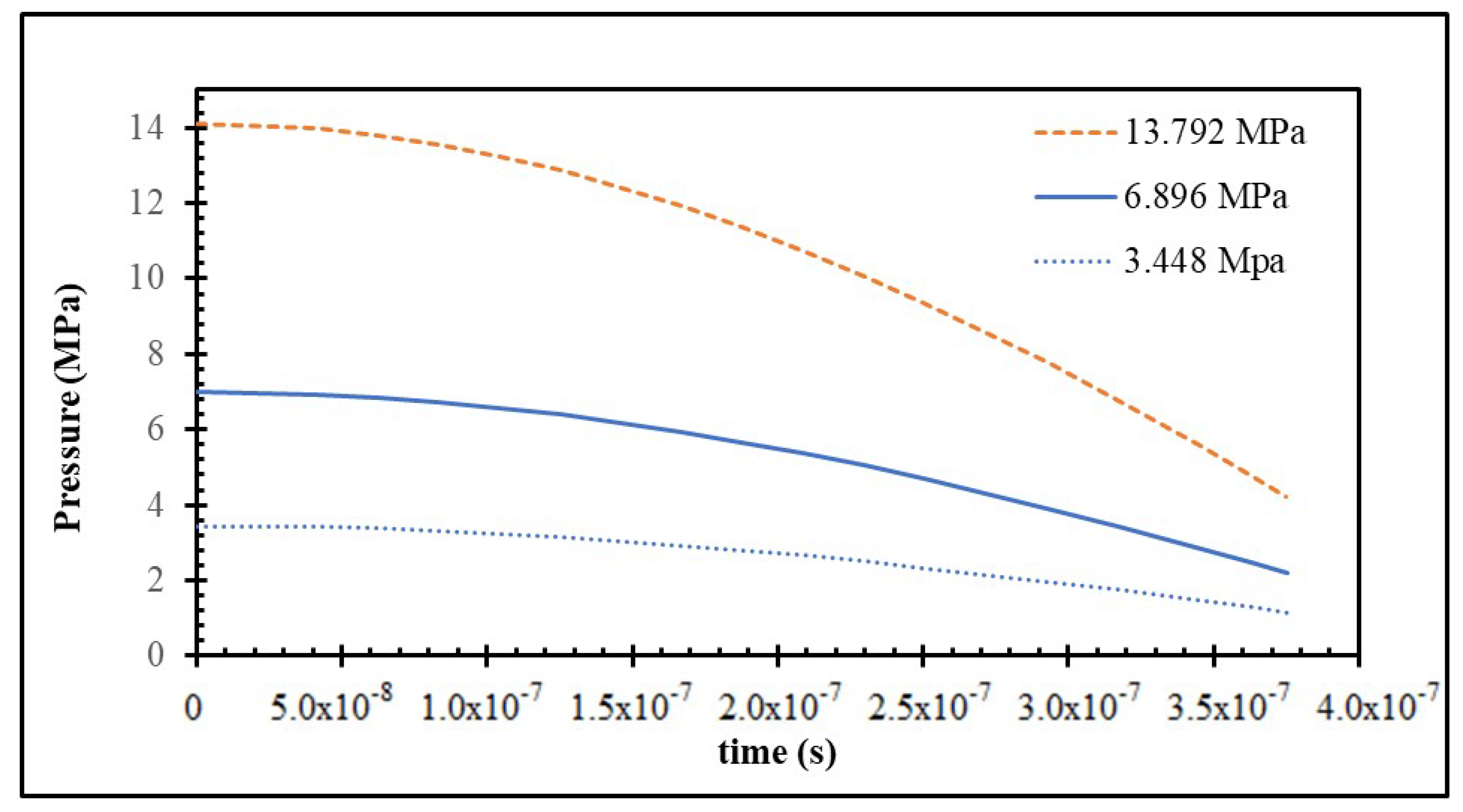 Table 3 together summarize the effect of initial internal gas pressure on the final residual pressure distribution at the inner radius, mid-wall region, and outer radius of the gas domain. For initial pressures of 3.448, 6.896, and 13.792 MPa, the corresponding residual pressures at the outer surface were 1.142, 2.192, and 4.233 MPa, respectively, demonstrating a nearly proportional relationship between the initial energy stored in the confined gas and the remaining load transmitted to the can wall after the initial expansion phase. A similar scaling behavior is observed at the inner radius (0.826, 1.672, and 3.311 MPa), reflecting the rapid decompression occurring close to the gas core. In contrast, the mid-wall region retains substantially higher residual pressures (6.978, 14.373, and 29.875 MPa). This behavior is consistent with the earlier pressure–temperature analyses, where the mid-wall region acted as a transient compression zone due to wave reflections and the opposing pressure gradients between the expanding inner gas and the resisting outer can. As a result, the mid-wall location becomes the primary reservoir of trapped or delayed gas energy during the decompression phase.