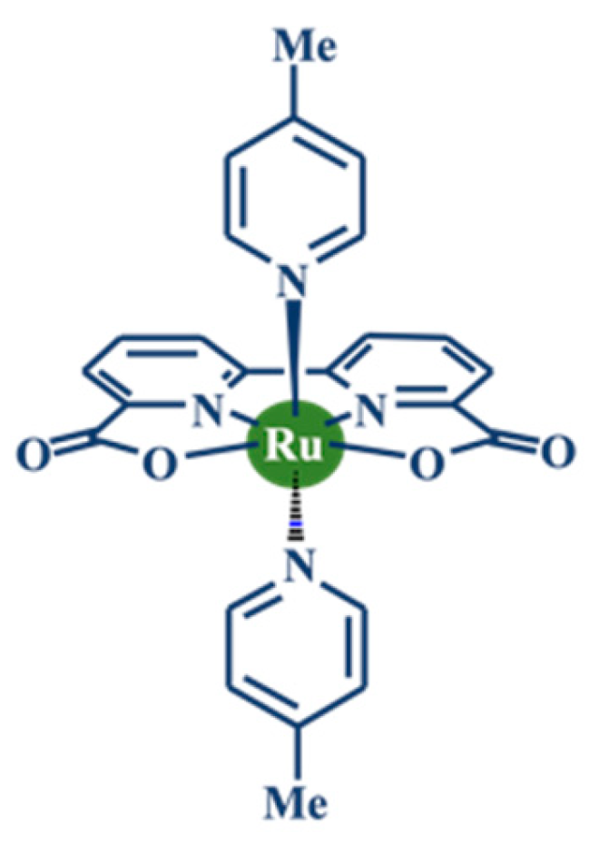 - Collin, J.P.; Sauvage, J.P. Synthesis and Study of Mononuclear Ruthenium(II) Complexes of Sterically Hindering Diimine Chelates. Implications for the Catalytic Oxidation of Water to Molecular Oxygen. Inorg. Chem. 1986, 25, 135–141. [Google Scholar] [CrossRef]