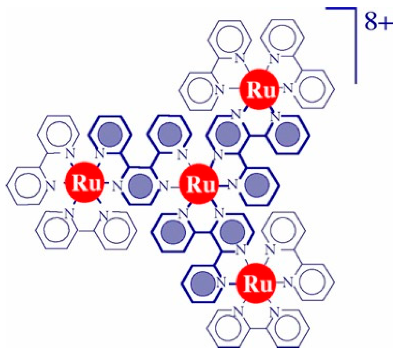 - Balzani, V.; Juris, A.; Venturi, M.; Campagna, S.; Serroni, S. Luminescent and Redox-Active Polynuclear Transition Metal Complexes. Chem. Rev. 1996, 96, 759. [Google Scholar] [CrossRef]