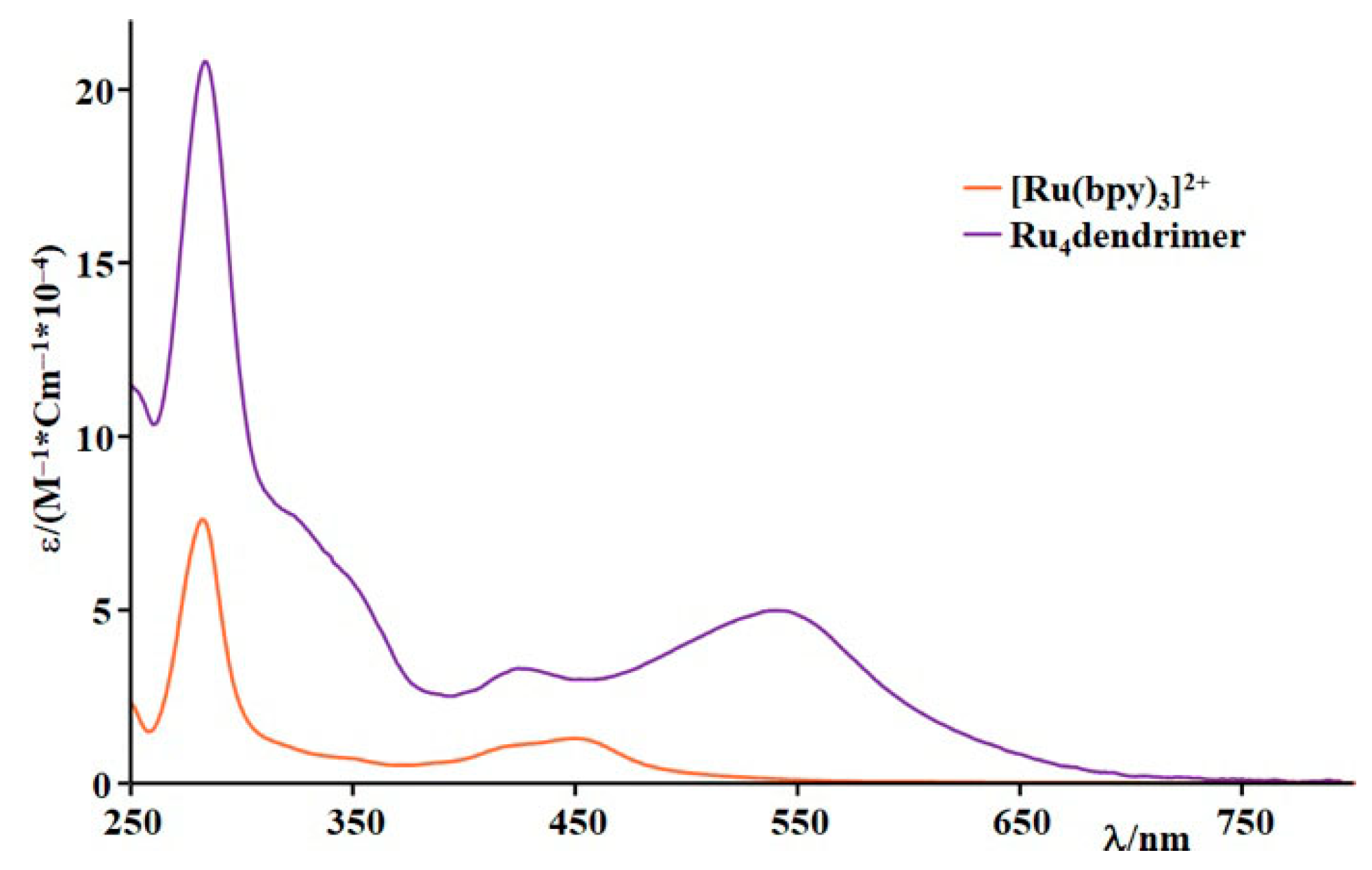 | Ru4dendrimer | 550 (53,500) 280 (130,000) | 782 | 0.002 | 51 | 727 | 1.38 | 4.00 × 104 | 1.99 × 107 |