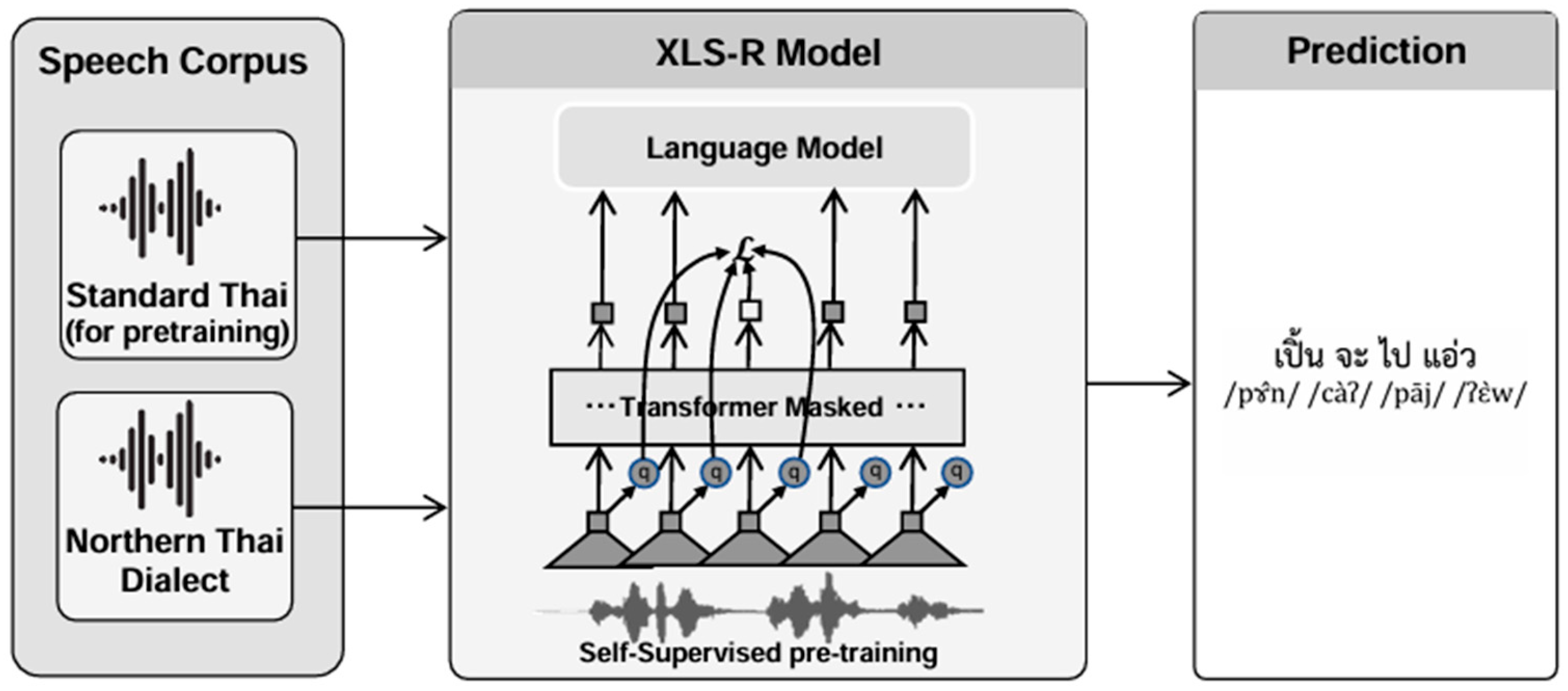 36] are other promising models, which are based on the Wav2Vec 2.0 model. The models rely on self-supervised learning on an extensive set of languages ranging from 53 languages (XLSR) to 128 languages (XLS-R). Moreover, XLS-R is pre-trained on tonal languages, including Mandarin and Vietnamese, which are similar to Thai in their use of tone. Like Wav2Vec 2.0, XLSR and XLS-R are usually employed by fine-tuning the recognition part of the model on a new downstream language task, while keeping the representation learning part unchanged. This assumes that the spoken languages share their majority of acoustic features [