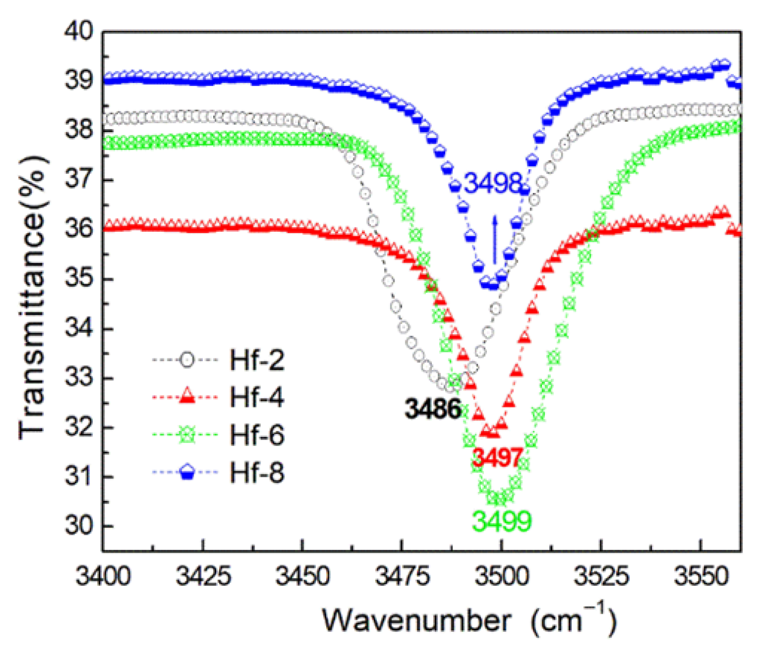 4+ doping has not drastically altered this primary defect environment. However, the significant and continuous blue shift at higher concentrations (Hf-4 to Hf-8) signifies a fundamental change. A higher wavenumber corresponds to a stronger O-H bond, typically resulting from the OH group being in a stronger local electric field. This is consistent with the formation of