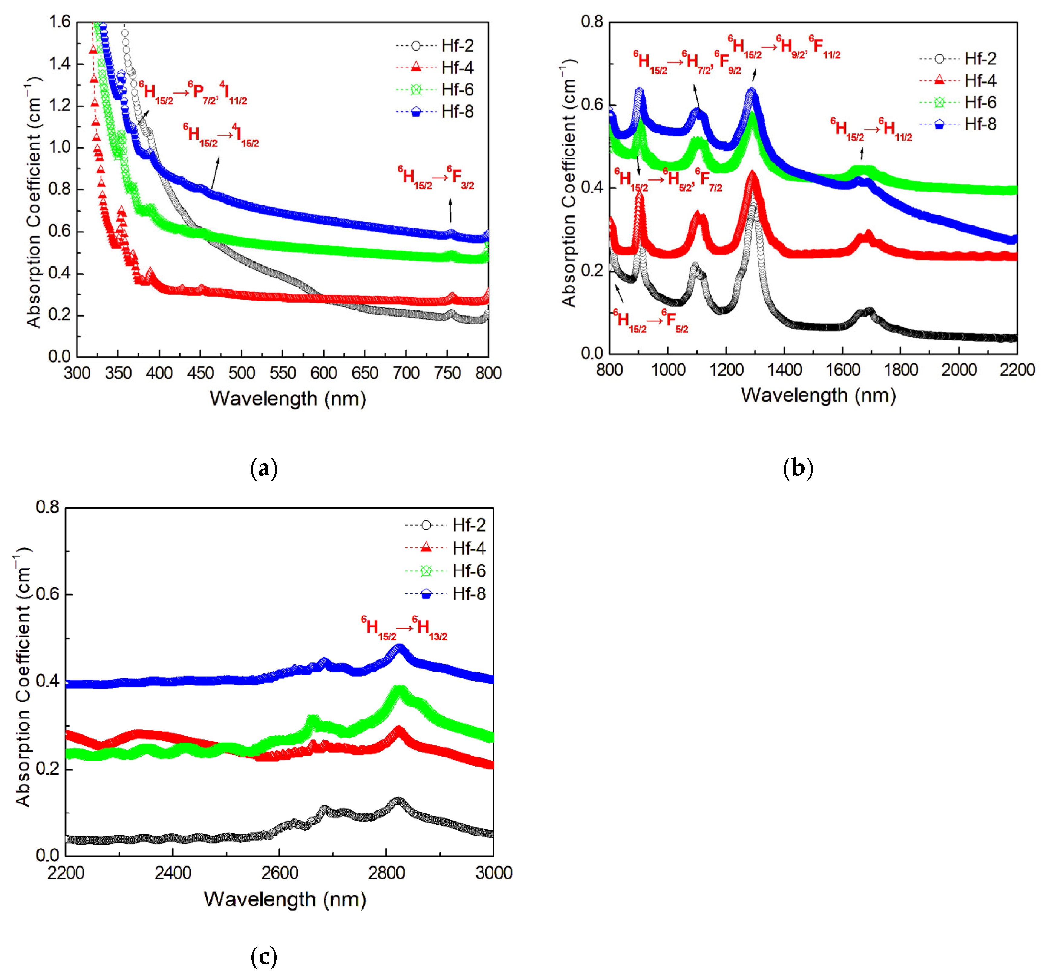 The actual concentrations of Hf and Dy ions in the as-grown crystals were determined by ICP-AES using an Optima 5300DV (Leeman, Sturtevant, WI, USA) instrument (estimated error < 6%, controlled by standard solution calibration and repeated measurements). The effective distribution coefficient (Keff), defined as the ratio of the ion concentration in the crystal (Cs) to that in the melt (Cl), was calculated to evaluate doping efficiency. The crystal structure and phase purity were characterized by XRD at room temperature using a Shimadzu XRD-6000 diffractometer (estimated error ± 0.04°, Shimadzu Corporation, Tokyo, Japan). Dopant-induced lattice distortions were assessed through systematic Rietveld refinement of XRD data. The meticulous refinement procedure ensured reliable extraction of the lattice constants. Critically, the systematic evolution of these parameters with Hf4+ concentration was unambiguous, as the changes observed were consistently greater than the precision of the measurement technique itself. The chemical bonding environment, particularly the configuration of OH− groups which is highly sensitive to the local defect structure, was probed by FT-IR spectroscopy. Transmission spectra were recorded in the wavenumber range of 400–4000 cm−1 using an Avatar-360 FT-IR Spectrometer (Niconet, Madison, WI, USA) with a resolution of 4 cm−1. The wavenumber calibration was performed using standard samples with known OH− absorption peaks. The observed blue shift of the OH− peak is well above the instrumental resolution. To investigate the electronic transitions and the local environment of the Dy3+ ions, UV–Vis–NIR absorption spectra were measured at room temperature using a Varian Cary 5000 spectrophotometer (Agilent Technologies, Inc., Santa Clara, CA, USA) over the spectral range of 300–3000 nm. This professional spectral data processing method was employed to ensure that the information of Dy3+ absorption peaks extracted from the raw data is accurate and reliable. The systematic enhancement in the integrated intensity of Dy3+ f-f transition peaks across samples was reproducible and exceeded the measurement fluctuations.