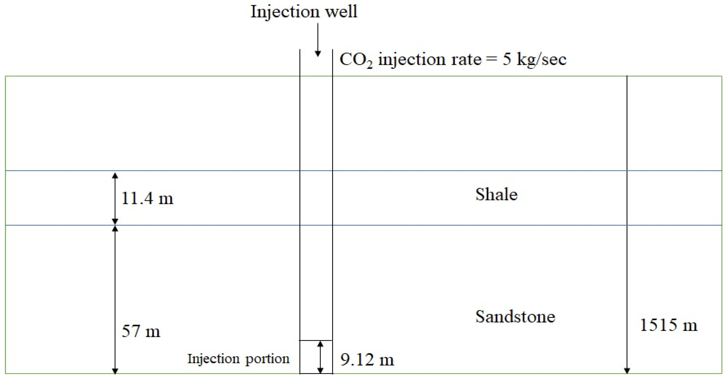 The 2D radial model depicting a cylindrical sandstone formation with a thickness of 57 m was assumed, schematics of the model are shown in