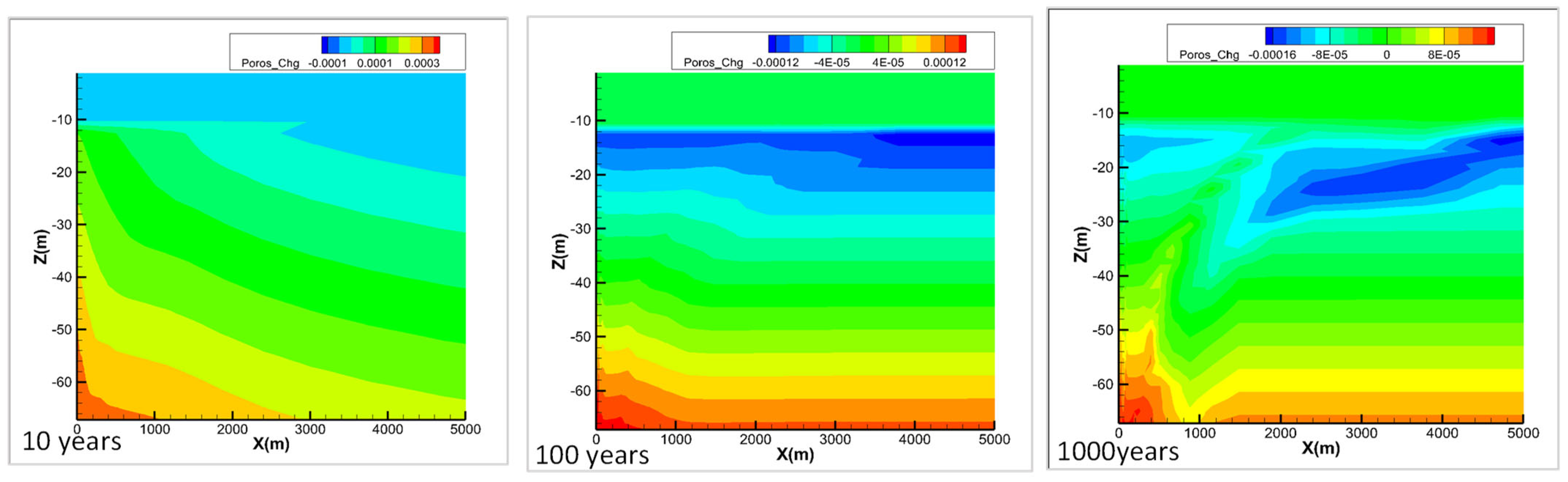Figure 13 shows the changes in porosity observed over the 1000-year period. It is observed that the porosity change is of the order of 10