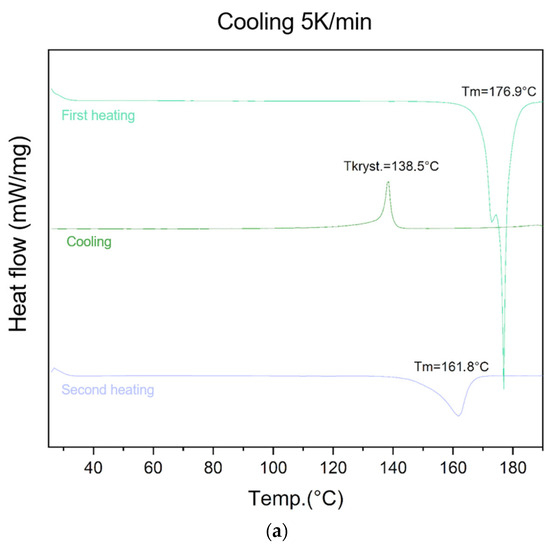 Similarly, for the cooling rate of 20 K/min, all three transitions were observed: melting at 176.6 °C (first heating), recrystallization at 135.6 °C (cooling), and endothermic transition at 161.8 °C (second heating).