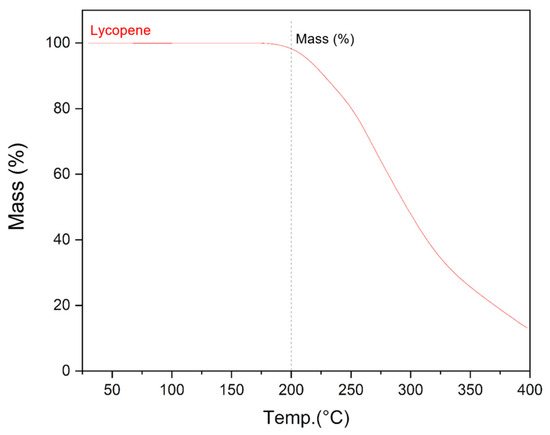 The use of hot-melt extrusion to obtain solid dispersions of lycopene with enhanced dispersibility involves exposure to elevated temperatures during processing. Prior to conducting this study, it was necessary to assess whether lycopene would degrade at the processing temperature of 150 °C. Thermogravimetric analysis showed that lycopene remains stable at 150 °C. A mass loss of approximately 2% was observed only upon heating to 200 °C, indicating sufficient thermal stability under the applied extrusion conditions (Figure 3).