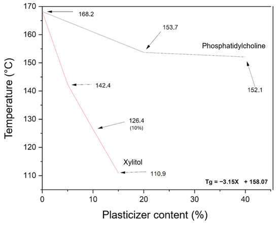 The evaluation of phosphatidylcholine’s effect on the selected polymer indicated only a minor plasticizing effect on PVP K30. Therefore, xylitol was introduced as an additional plasticizer. The relationship between xylitol content (5–15%) and the resulting thermal properties was found to be linear, allowing the derivation of a linear function to calculate the xylitol content required to achieve the desired glass transition temperature (Tg) for the PVP K30–phosphatidylcholine–xylitol mixture.