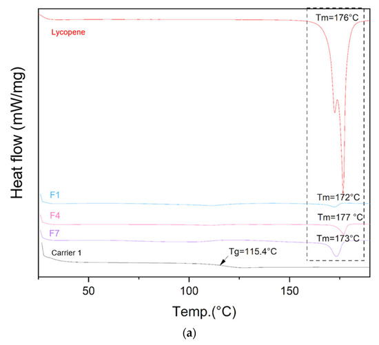 The DSC thermograms of lycopene, carriers and extrudates are presented in Figure 5.