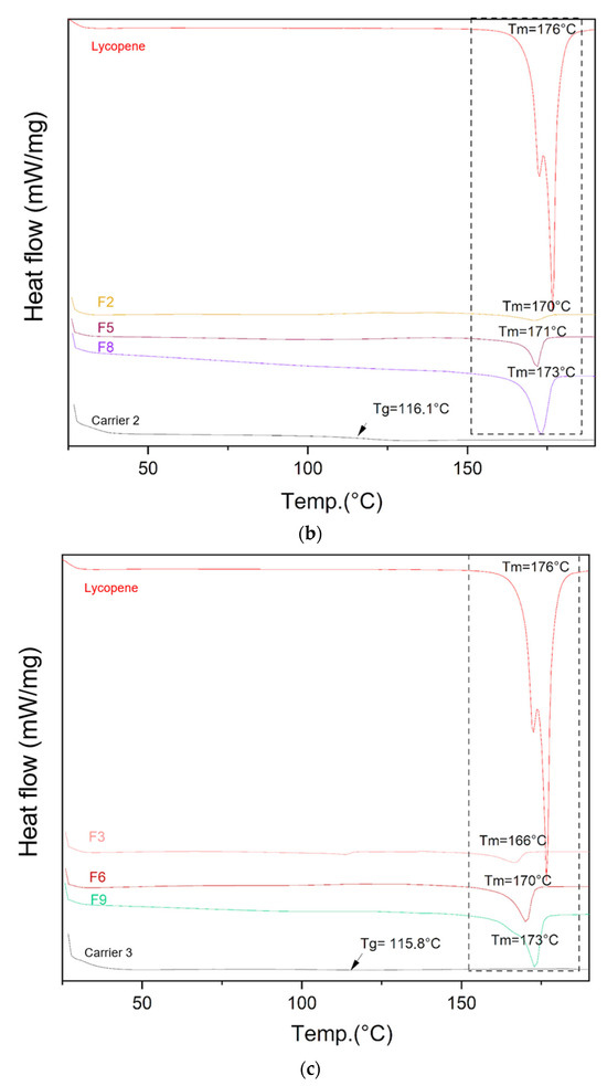 Differential scanning calorimetry was used to evaluate the thermal properties of the prepared systems. The glass transition temperatures (Tg) of the carriers were similar: 115.4 °C for carrier 1, 116.1 °C for carrier 2, and 115.8 °C for carrier 3, in accordance with the design specifications. Endothermic peaks corresponding to lycopene melting were observed on the thermograms of the prepared formulations, indicating the presence of crystalline regions within the dispersions.