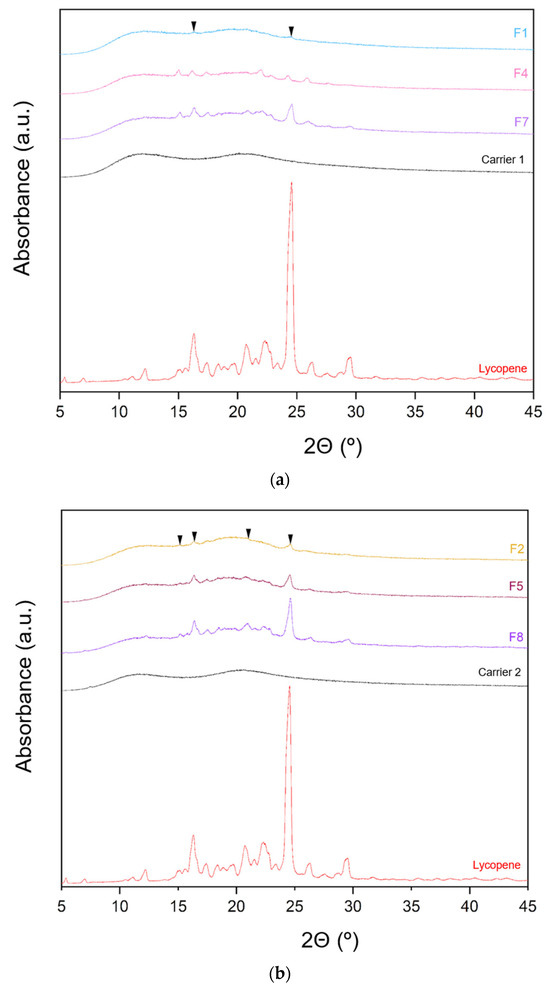 Ma et al. [46] demonstrated that lycopene incorporated into HP-β-CD or PEG systems prepared by hot-melt extrusion underwent complete amorphization, as shown by the disappearance of its melting peak and the absence of XRPD reflections. In contrast, our extrudates still exhibited a detectable melting transition and retained weakened crystalline peaks, indicating that the carriers used in our study do not stabilize lycopene to the same extent as the HME-processed cyclodextrin systems described by MA.