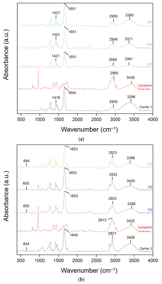 In our previous study with lycopene–PVP K30 systems prepared by ball milling, we also observed shifts in the carbonyl stretching band of PVP K30 and the disappearance of lycopene-specific signals in amorphous systems, indicating non-covalent stabilization, particularly through dipole-induced dipole interactions [30].