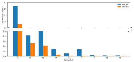 The highest lycopene dispersibility at both time points was observed for formulation F1, reaching 1.0484 mg/mL after 3 h and 0.7619 mg/mL after 24 h. This formulation did not contain phosphatidylcholine, and the unexpectedly high dispersibility is likely associated with limited compatibility of lycopene with the highly hydrophilic PVP–xylitol matrix, promoting partial phase segregation of lycopene toward the surface of the extrudate and facilitating its removal during dispersion and methanol extraction. Formulation F4, which also lacked phospholipid, showed increased dispersibility compared to formulations with the same lycopene content but containing phosphatidylcholine.