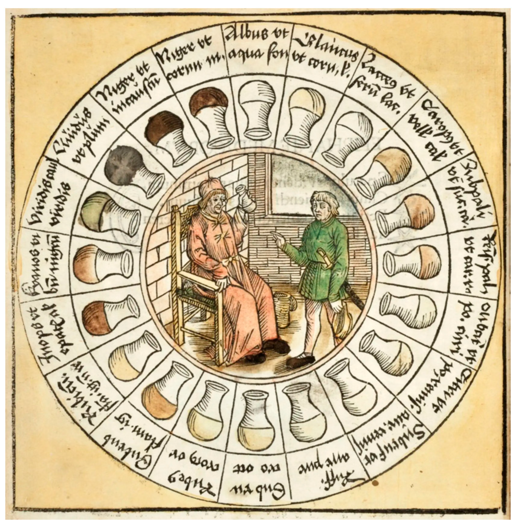 - Pinder, U. Epiphanie Medicorum. Speculum Videndi Urinas Hominum, 1506. Available online: https://digital.staatsbibliothek-berlin.de/werkansicht?PPN=PPN847099202&DMDID=&PHYSID=PHYS_0004 (accessed on 25 November 2024).