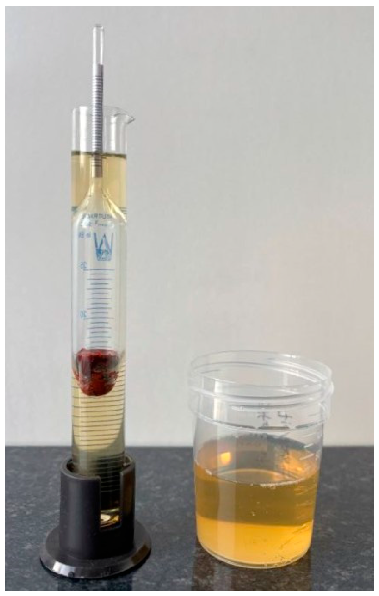 - Murata, K.; Lieske, J.; Karon, B.S. Tips from the Clinical Experts. Color, Clarity of Urine Is Important. Available online: https://www.mlo-online.com/home/article/13003454/answering-your-questions (accessed on 10 September 2024).
