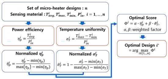 The optimal score defined in this manner can reflect the relative importance of the two metrics using weighting factors, and is useful for quickly and consistently comparing the performances of various micro-heater pattern structures. Accordingly, this study proposes a framework (Figure 2) for accurately and efficiently evaluating the performance of micro-thermal heater pattern structures. Here, the superscript * denotes the optimal design. Simulations were conducted using six different micro-thermal heater pattern structures to validate the proposed framework. Power efficiency and temperature uniformity metrics were calculated from the temperature distributions of the sensing materials obtained from the simulations. Finally, based on these two metrics, the optimal score was computed to identify the micro-heater pattern with the best performance.