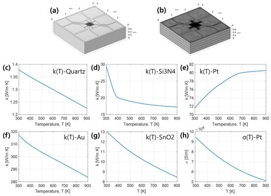 (a) Geometry of the metal oxide gas sensor and (b) meshing configuration for numerical simulation. Temperature-dependent thermal conductivity of (c) quartz, (d) , (e) Pt, (f) Au, and (g) , and (h) temperature-dependent electrical conductivity of Pt used in the simulations.