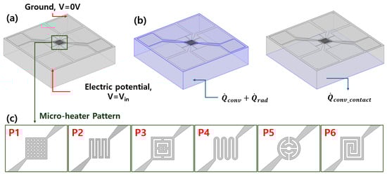 Boundary conditions and design configurations: (a) Electrical boundary conditions with the ground set to 0 V and the input potential applied as . (b) Thermal boundary conditions including natural convection, radiation, and substrate contact conduction. (c) Six micro-heater pattern designs (P1–P6).