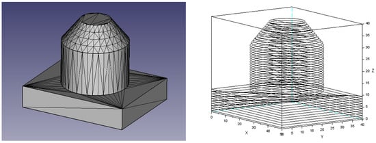 Figure 4 shows a concrete example for the case of a simple part composed of a brick, a cylinder, and a conical part. The STL mesh generated by FreeCAD is shown on the left, and the corresponding slices are shown on the right (plot of the successive lines with SCILAB [28], including connecting lines between successive slices). Even if all slice contours look like circles in the top part, these circles are made of straight edges, forming closed polygons. In the present case, the different slices are formed by a little more than 2200 straight edges.