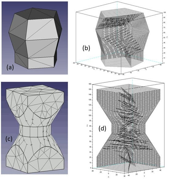 Design of parts manufactured by WAAM (a,c), and corresponding robot trajectories provided by the slicer software (b,d).
