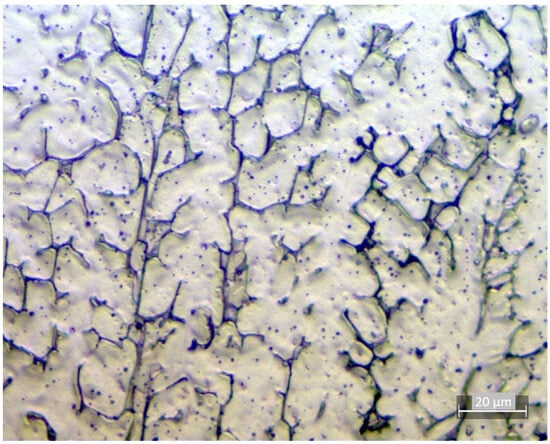 Specifically, the δ-ferrite phase can form at high temperatures and probably appeared during the manufacturing process. This phase may decrease the risk of hot cracking if its content is lower than 8%. However, it can be detrimental to corrosion resistance if its content becomes higher than 10%. According to the Schaeffler diagram [29], the ferrite content of AISI 316L steel after solidification and cooling should be about 5%. The typical microstructure of the AISI 316L samples manufactured by WAAM with the parameters provided in Table 1 is shown in Figure 10.