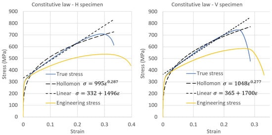Tensile tests’ loading curves in both horizontal (left) and vertical (right) directions, and engineering stress (orange color), and true stress (blue color), with the corresponding Hollomon and bilinear fitting curves.