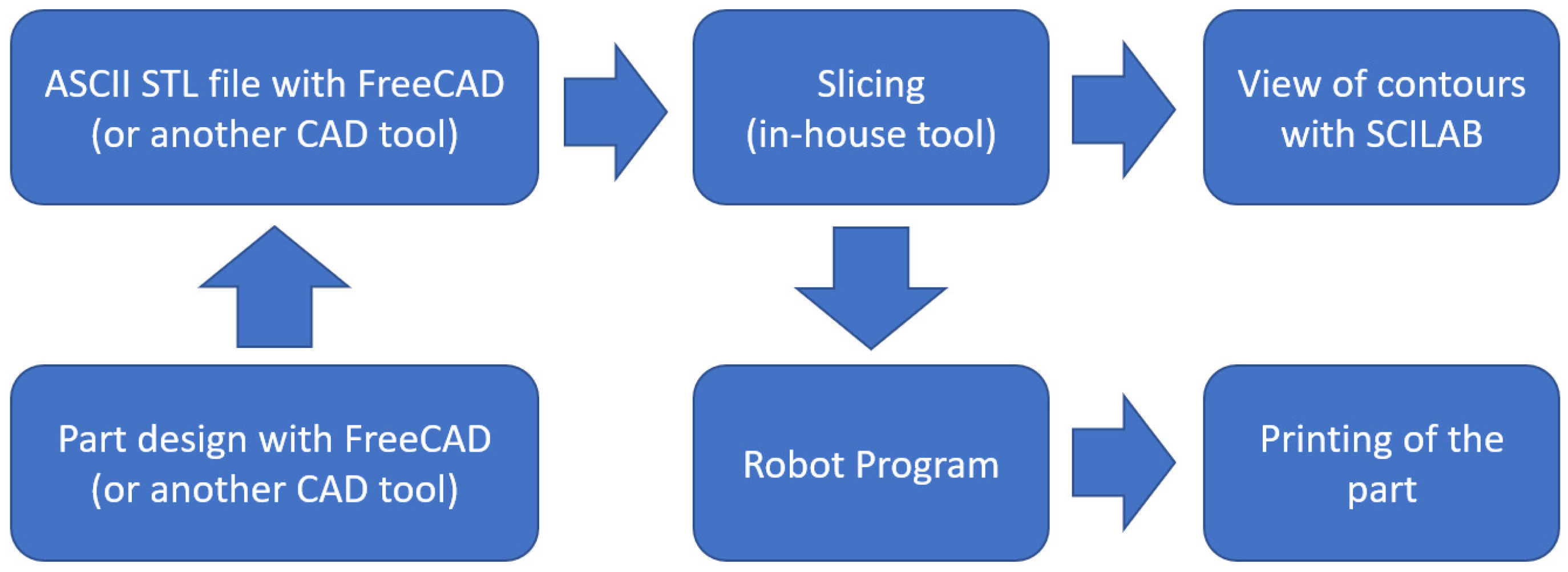 - Development of a slicer that can provide directly the robot program (sequence of instructions) in KRL format (case of KUKA robots) from the CAD design of the part to be printed;
