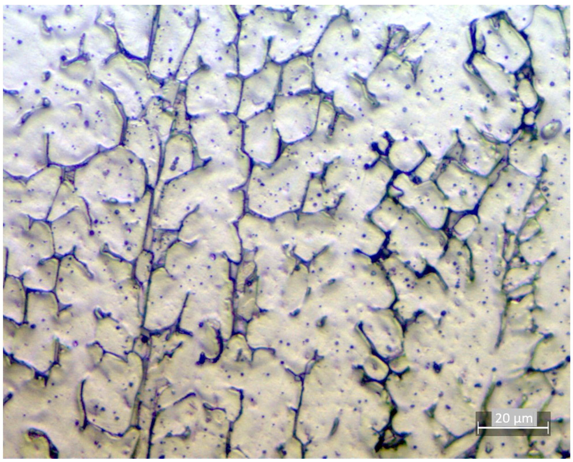 3.3.1. Microstructure and Ferrite Content of WAAM Samples