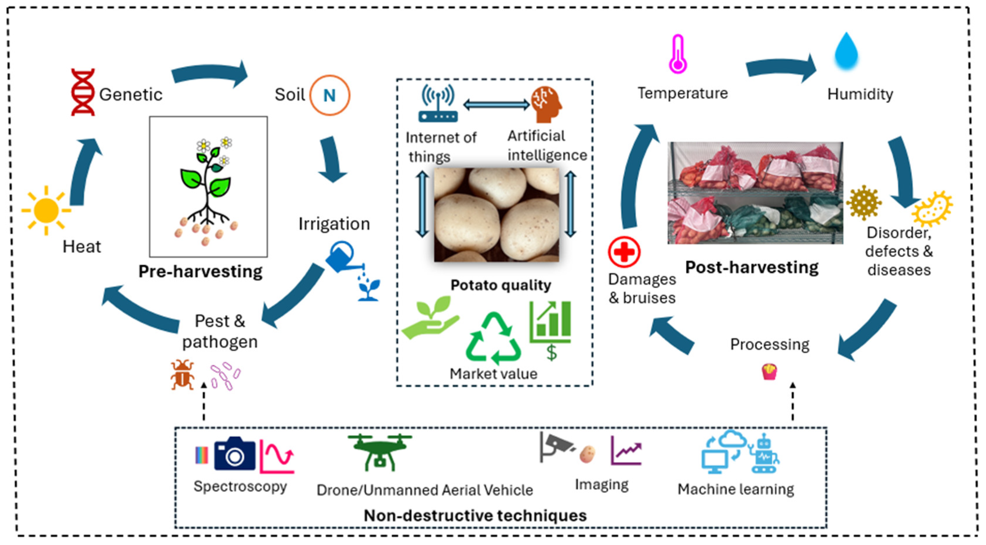 Chicago/Turabian StyleKeithellakpam, Lakshmi Bala, Chithra Karunakaran, Chandra B. Singh, Digvir S. Jayas, and Renan Danielski. 2026. "A Comprehensive Review on Pre- and Post-Harvest Perspectives of Potato Quality and Non-Destructive Assessment Approaches" Applied Sciences 16, no. 1: 190. https://doi.org/10.3390/app16010190