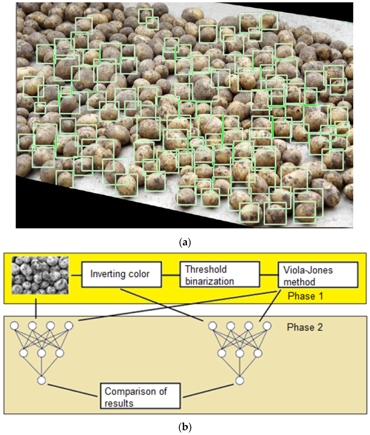 | Detection of disease and damaged potatoes on the moving conveyor | Computer machine vision | Detect and classify 100 potatoes per second with high accuracy | Different methods can be selected for classification | [170] | |