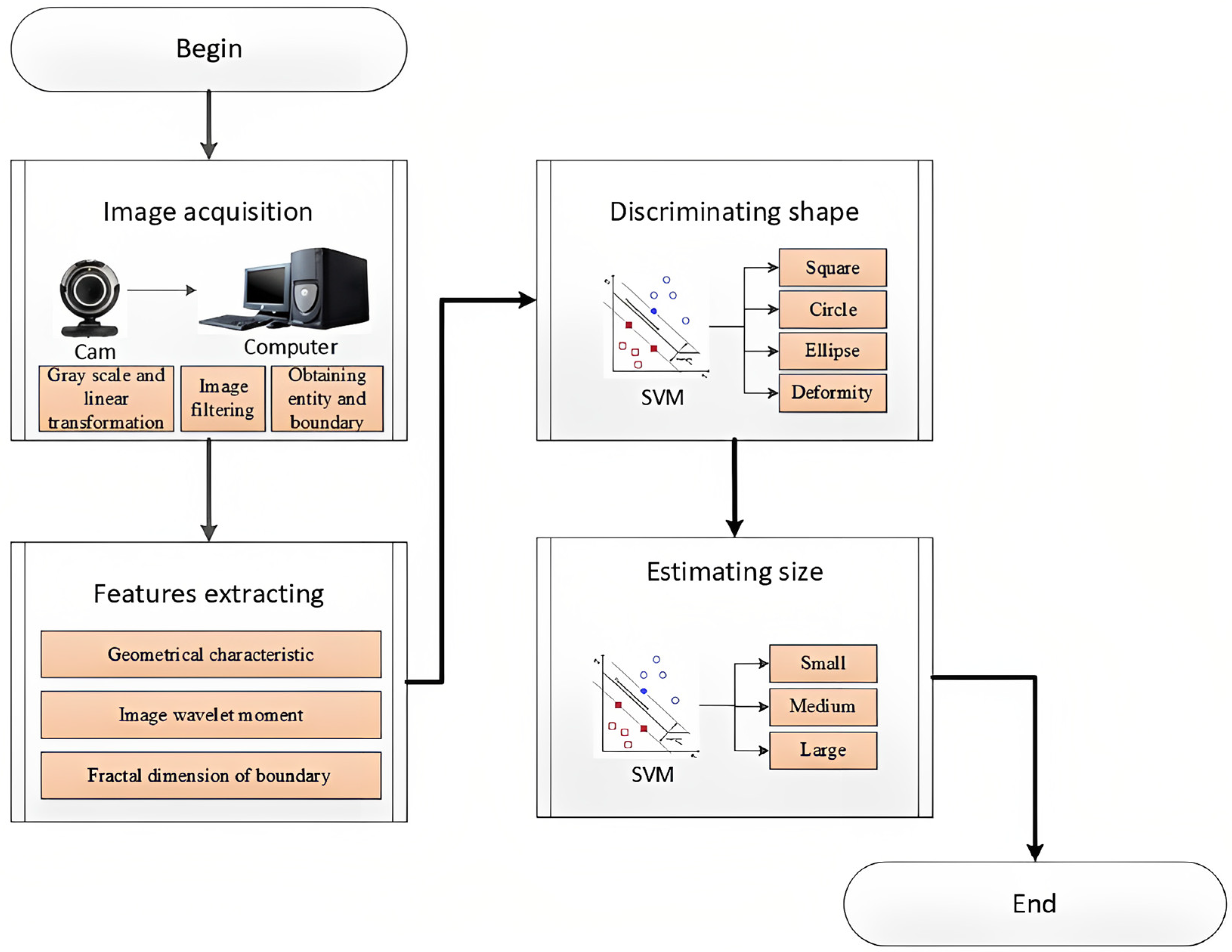 | Shape and size | Machine vision system | 88.89% and 87.41% discrimination accuracy SVM polynomial kernel and linear kernel, respectively | High-quality camera and improved system design can be explored | [182] | |