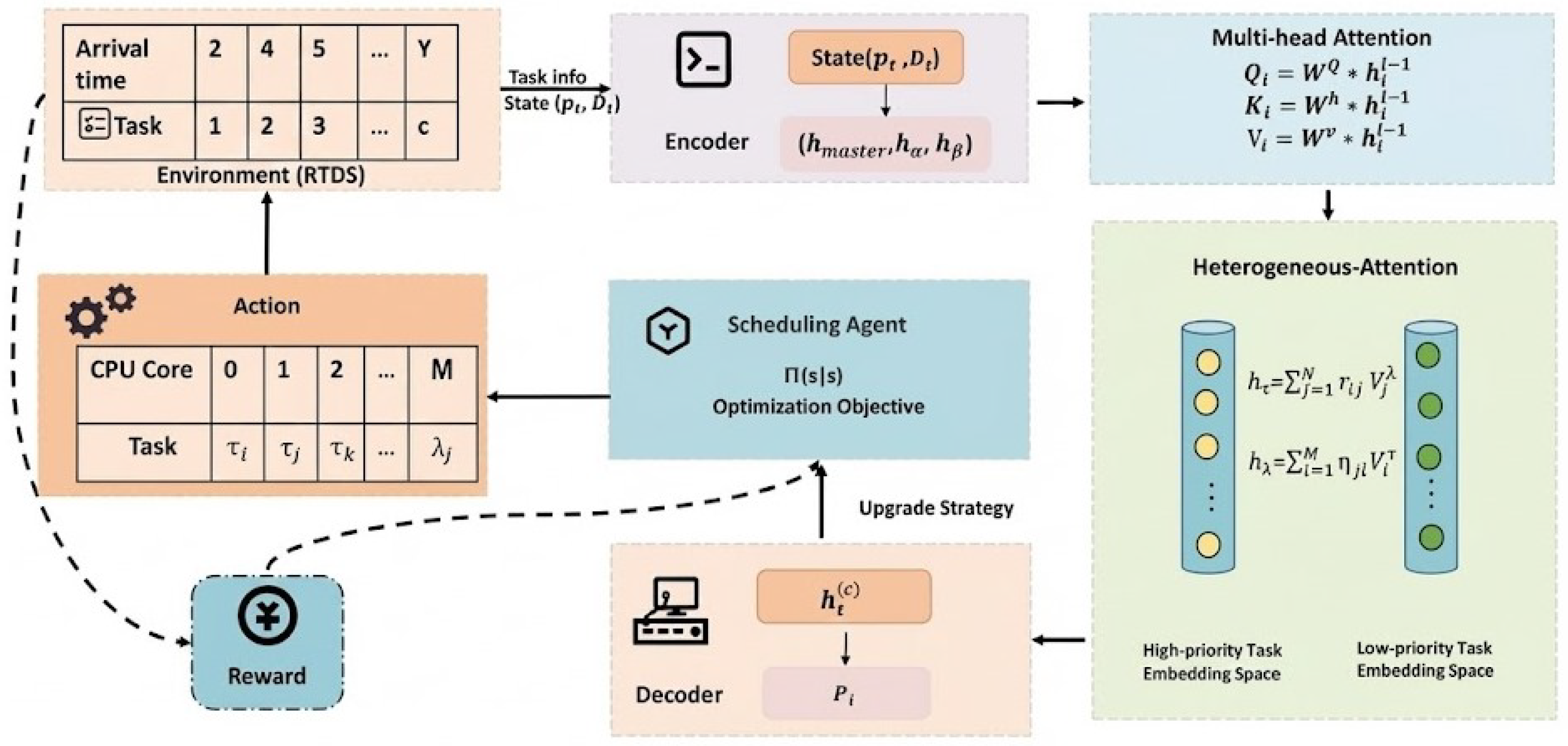 - Algorithm Framework: We introduce a deep reinforcement learning (DRL) framework to achieve dynamic, adaptive adjustment of task priorities and resource allocation. By employing multi-head and heterogeneous attention mechanisms, the proposed method breaks through the rigid limitations of traditional rule-based scheduling.