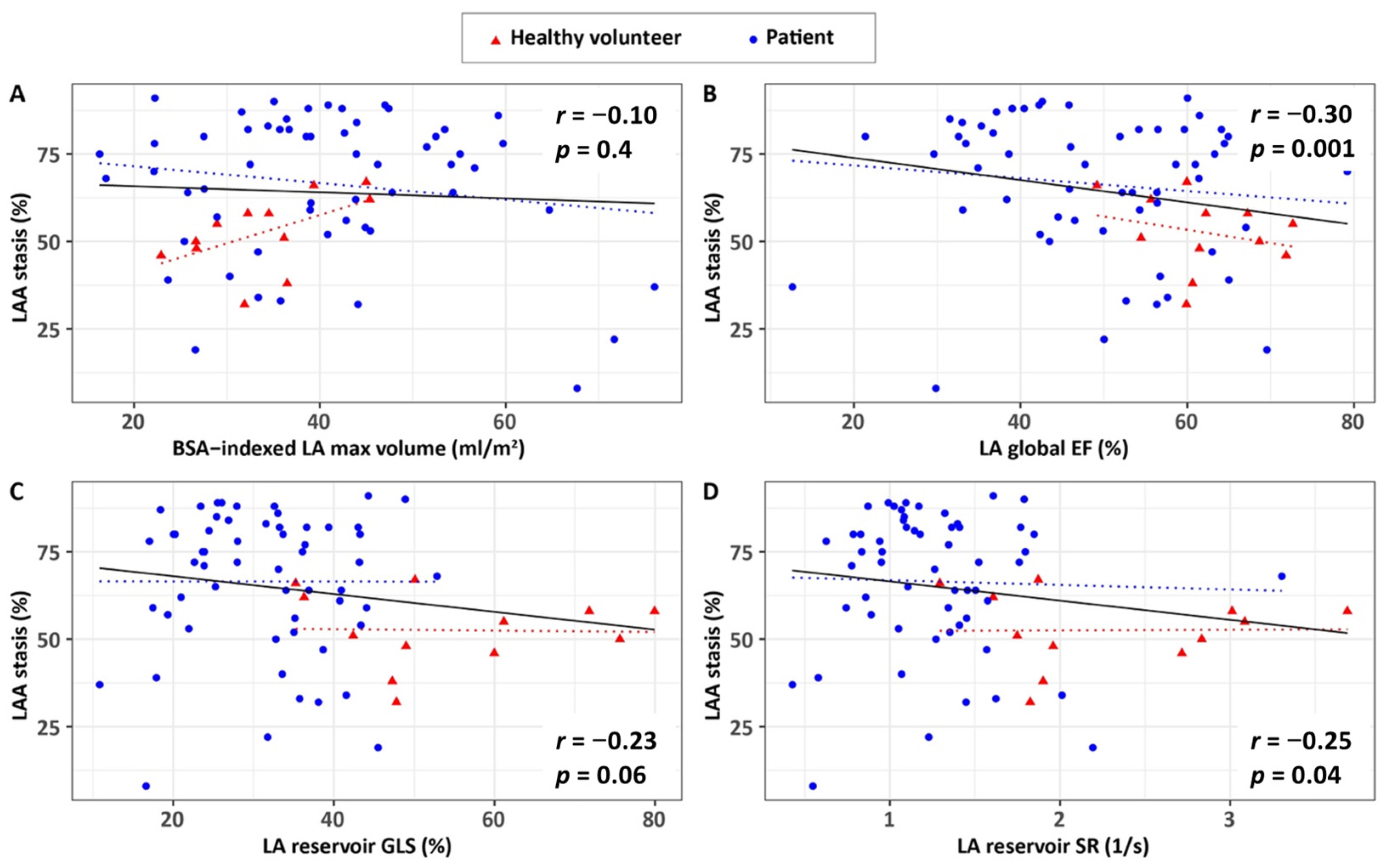 | LA mean stasis, % | 34.5 (22.8, 45.3) | 45.0 (36.0, 54.0) | 0.040 | <0.001 |