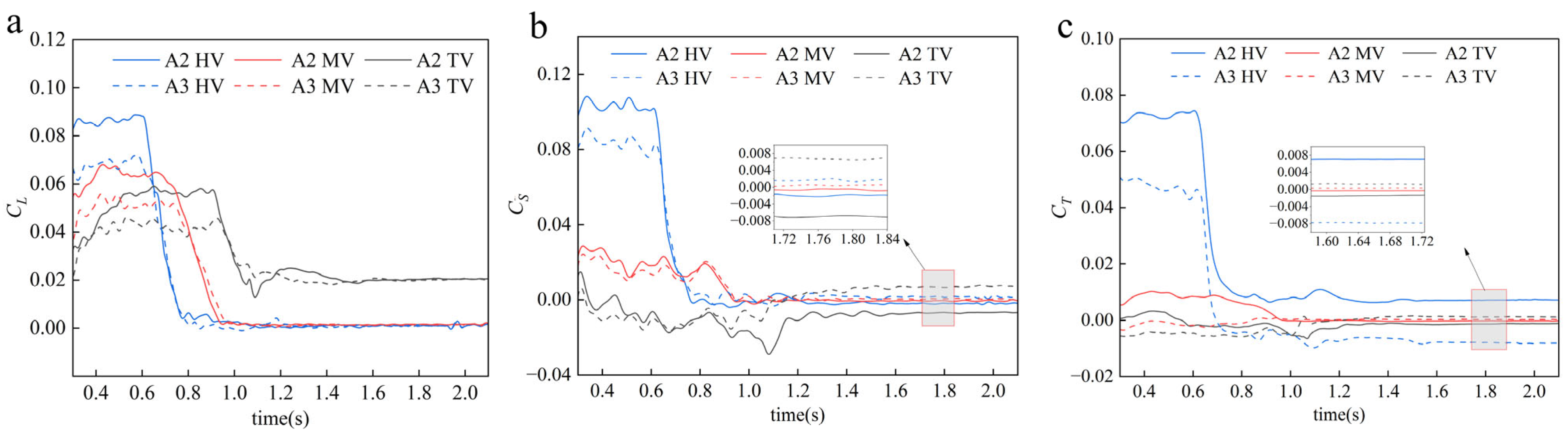 Figure 11b illustrates the time-history curves of aerodynamic lateral force coefficients across train sections under Cases A2 and A3. Comparative analysis with