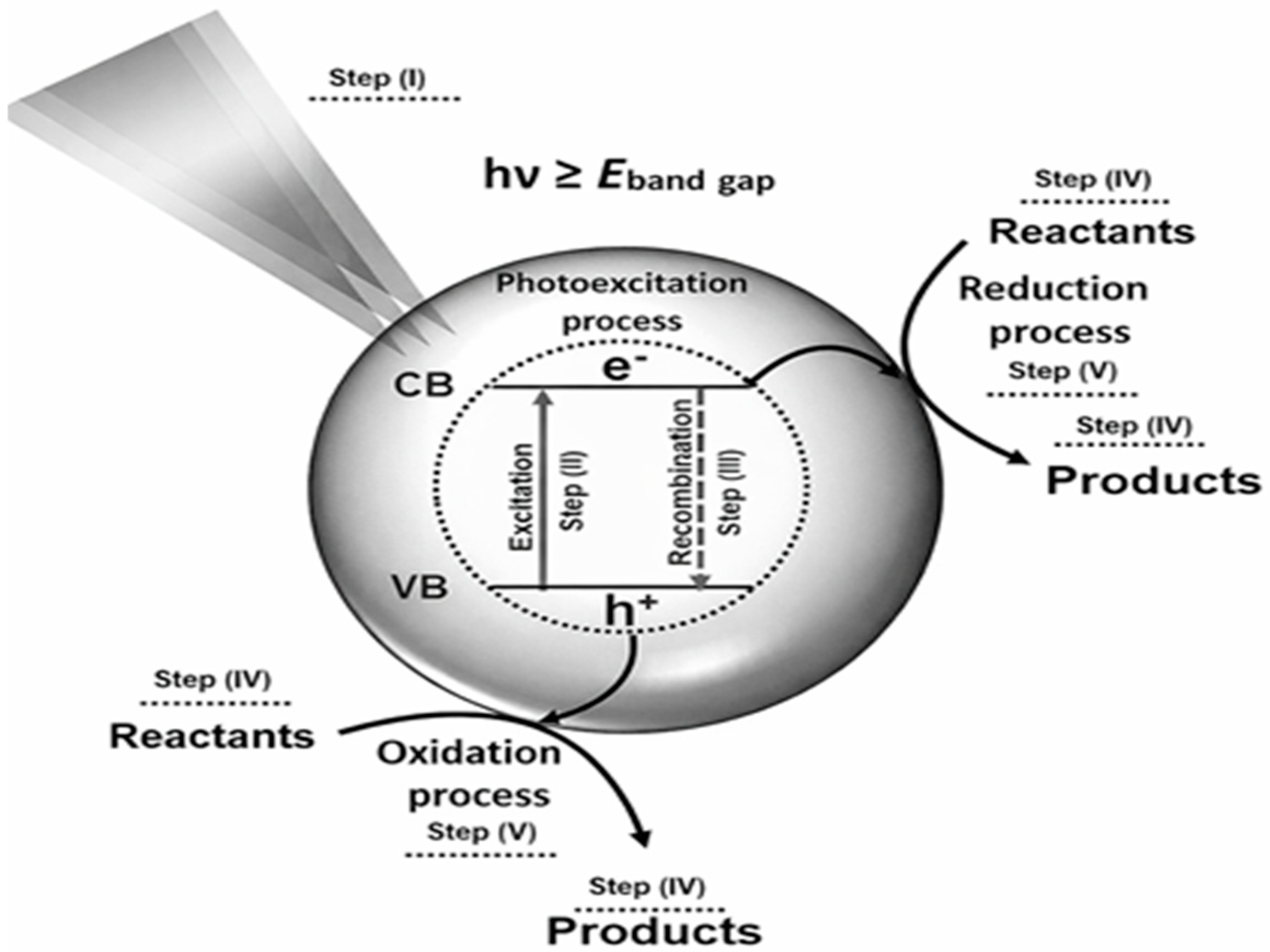 - Redox reactions at the surface, wherein holes drive oxidation processes (e.g., •OH generation) and electrons facilitate reduction reactions (e.g., O2•− formation).