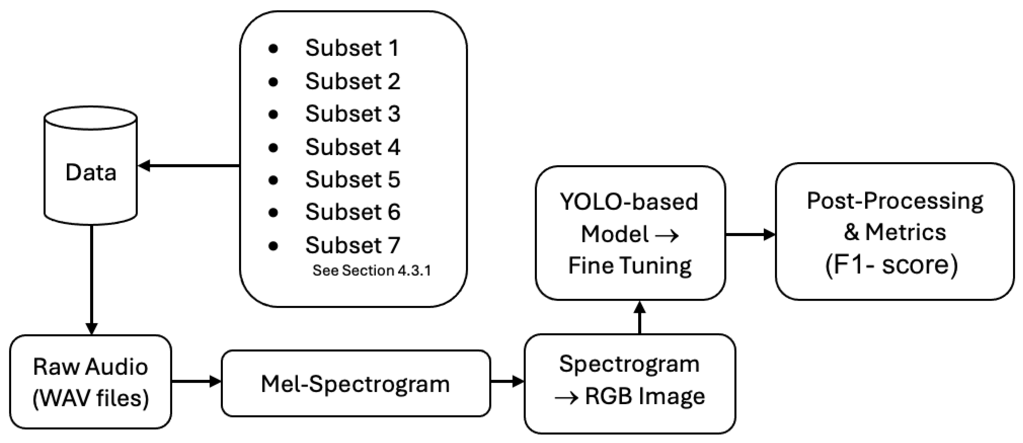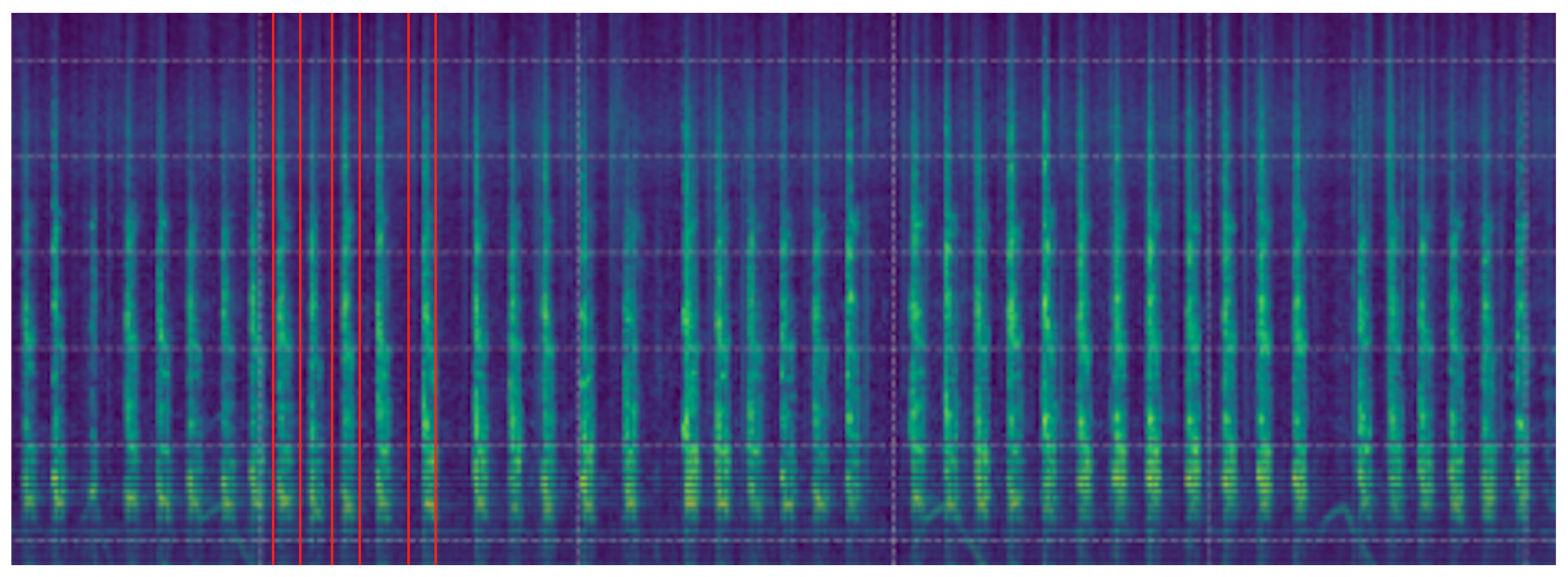 Figure 2) occupy only a very small temporal region in the mel-spectrogram and therefore correspond to tiny regions in the 640 × 640 image processed internally by YOLO. This severely limits the effective receptive field covering these events and often results in insufficient discriminative evidence for the detector to produce reliable bounding boxes. To illustrate this phenomenon, we include a visualization of the actual model input for an audio clip containing dog barks. This example highlights the minimal spatial footprint of short events and motivates future improvements based on temporal zooming or sliding-window segmentation, which could provide finer temporal granularity and enrich local context for the detector.