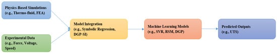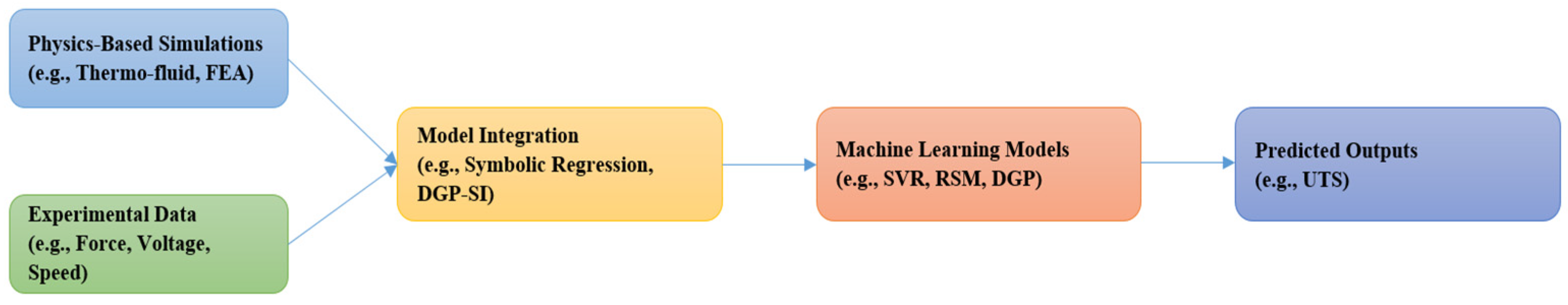 | [57] | Hybrid physics-based & data-driven approach | Finite Element (FE) simulations (Johnson–Cook material model, Coulomb–Tresca friction, ALE re-mesh) | Physics-Informed Hybrid: Physically validated simulations are used as a rich and reliable data source to train various ML algorithms (AdaBoost, SVR, etc.), ensuring predictions are grounded in physical principles. | Machining of Ni-based superalloy IN625 (cutting temperature & force prediction) | Speed and lower cost compared to expensive physical experiments; increased reliability due to results consistent with theoretical expectations. | High simulation cost; hyperparameter sensitivity |