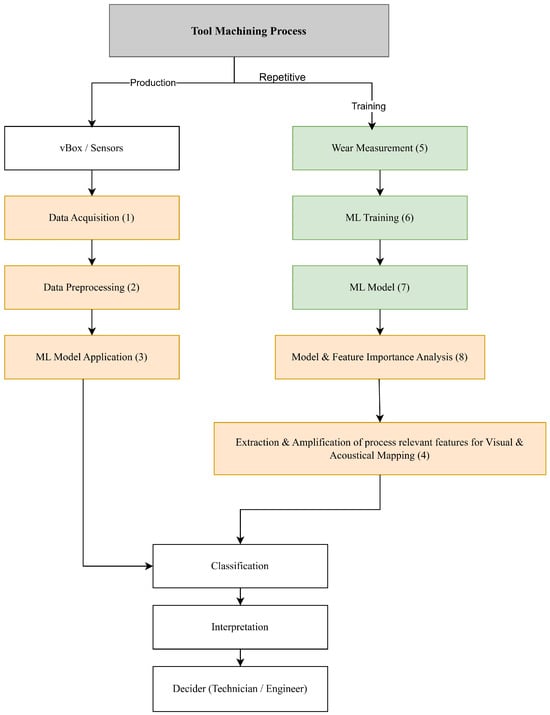 - Liu, D.; Liu, Z.; Wang, B.; Song, Q.; Wang, H.; Zhang, L. Leveraging Artificial Intelligence for Real-Time Indirect Tool Condition Monitoring: From Theoretical and Technological Progress to Industrial Applications. Int. J. Mach. Tools Manuf. 2024, 202, 104209. [Google Scholar] [CrossRef]