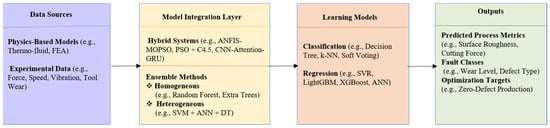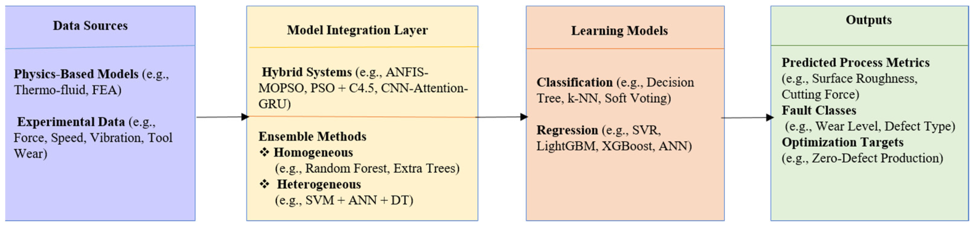 | [81] | Heterogeneous Model Hybrid | ANN + Decision Tree + k-NN | Comparative Ensemble (Soft Hybrid): Uses multiple, fundamentally different algorithms in parallel; the best-performing model for each output variable is selected, leveraging their inherent strengths. | Cutting force and surface roughness prediction in milling | Complementary Strength Utilization: Acknowledges that no single algorithm is best for all tasks; selects the most suitable model for each specific output. | Small dataset; lack of model explainability. |